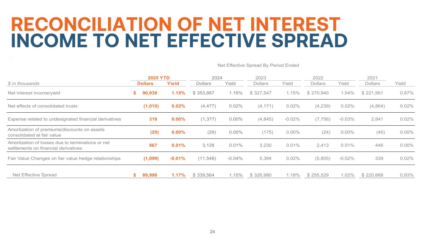 24 RECONCILIATION OF NET INTEREST INCOME TO NET EFFECTIVE SPREAD 2023 2022 2021 $ in thousands Dollars Yield Dollars Yield Dollars Yield Dollars Yield Dollars Yield Net interest income/yield 90,939$ 1.15% 353,867$ 1.16% 327,547$ 1.15% 270,940$ 1.04% 221,951$ 0.87% Net effects of consolidated trusts (1,010) 0.02% (4,477) 0.02% (4,171) 0.02% (4,239) 0.02% (4,864) 0.02% Expense related to undesignated financial derivatives 318 0.00% (1,377) 0.00% (4,845) -0.02% (7,756) -0.03% 2,841 0.02% Amortization of premiums/discounts on assets consolidated at fair value (25) 0.00% (29) 0.00% (175) 0.00% (24) 0.00% (45) 0.00% Amortization of losses due to terminations or net settlements on financial derivatives 867 0.01% 3,128 0.01% 3,230 0.01% 2,413 0.01% 446 0.00% Fair Value Changes on fair value hedge relationships (1,099) -0.01% (11,548) -0.04% 5,394 0.02% (5,805) -0.02% 339 0.02% Net Effective Spread 89,990$ 1.17% 339,564$ 1.15% 326,980$ 1.18% 255,529$ 1.02% 220,668$ 0.93% 2025 YTD Net Effective Spread By Period Ended 2024