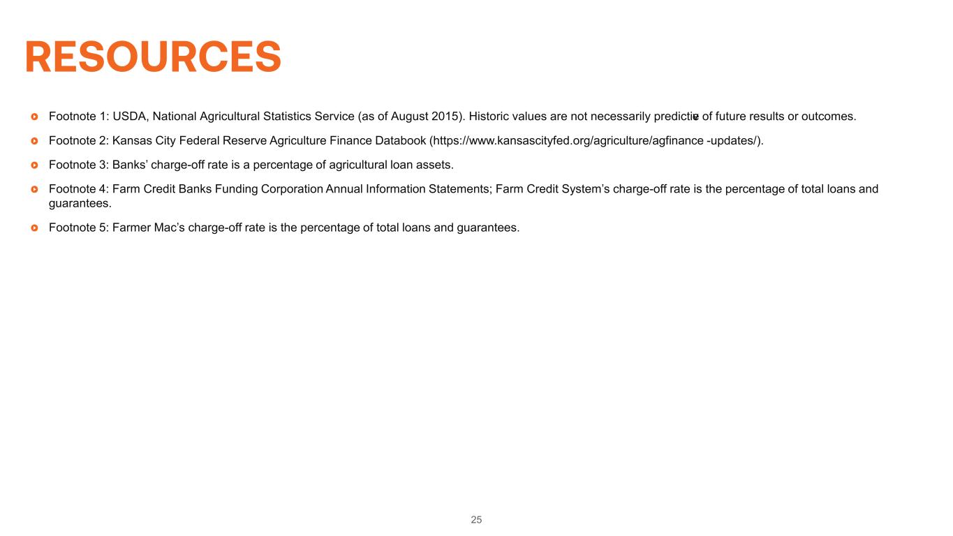 25 RESOURCES Footnote 1: USDA, National Agricultural Statistics Service (as of August 2015). Historic values are not necessarily predictive of future results or outcomes. Footnote 2: Kansas City Federal Reserve Agriculture Finance Databook (https://www.kansascityfed.org/agriculture/agfinance -updates/). Footnote 3: Banks’ charge-off rate is a percentage of agricultural loan assets. Footnote 4: Farm Credit Banks Funding Corporation Annual Information Statements; Farm Credit System’s charge-off rate is the percentage of total loans and guarantees. Footnote 5: Farmer Mac’s charge-off rate is the percentage of total loans and guarantees.