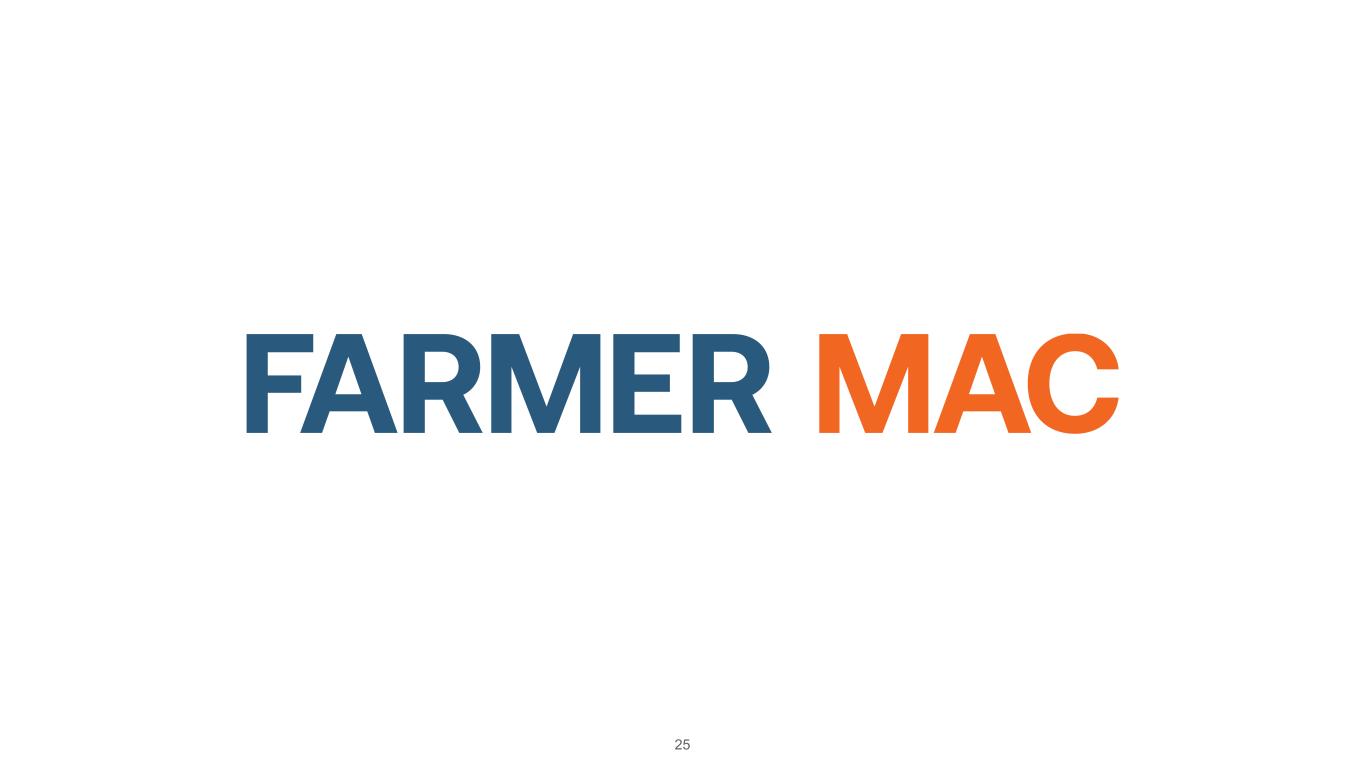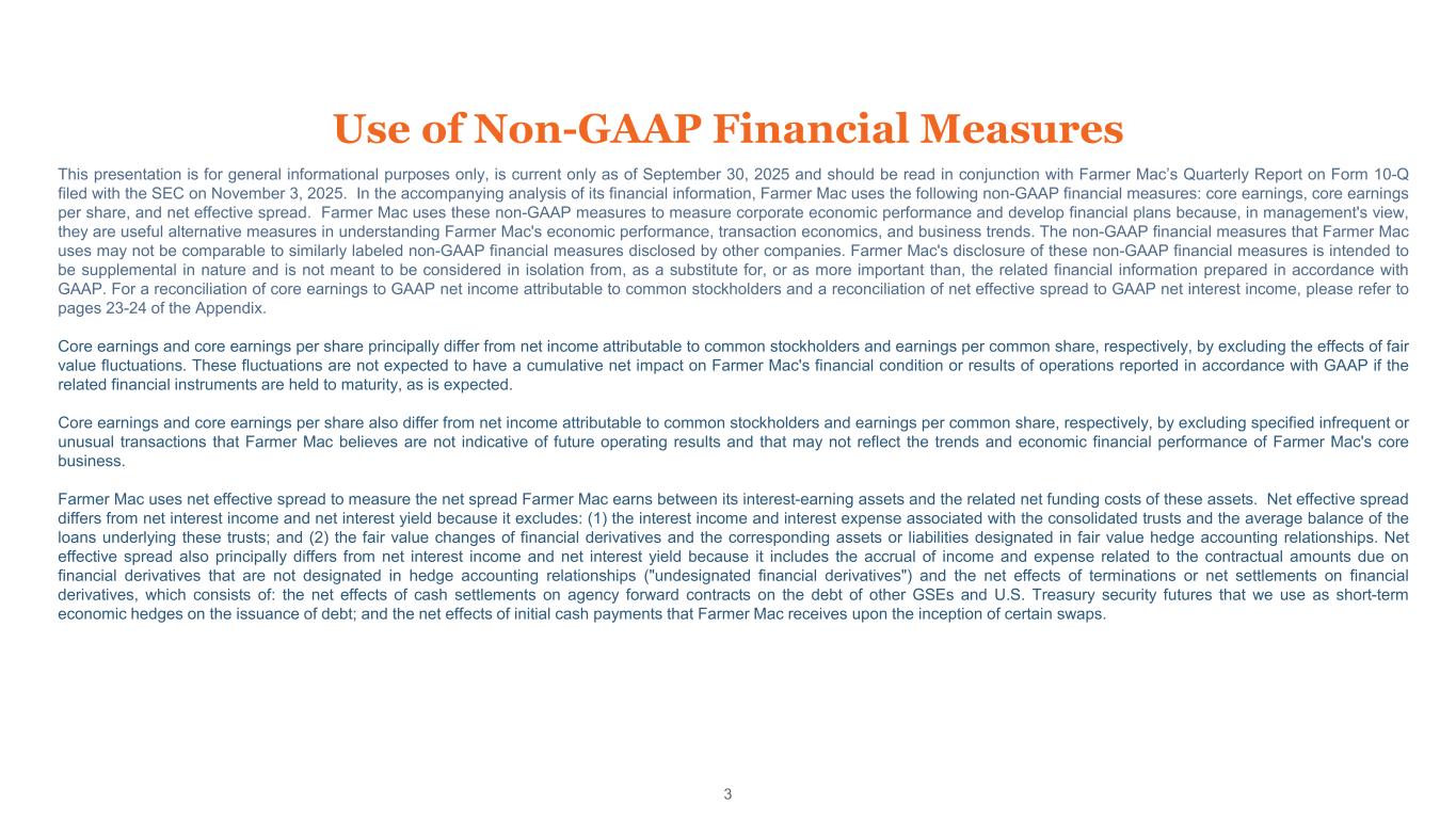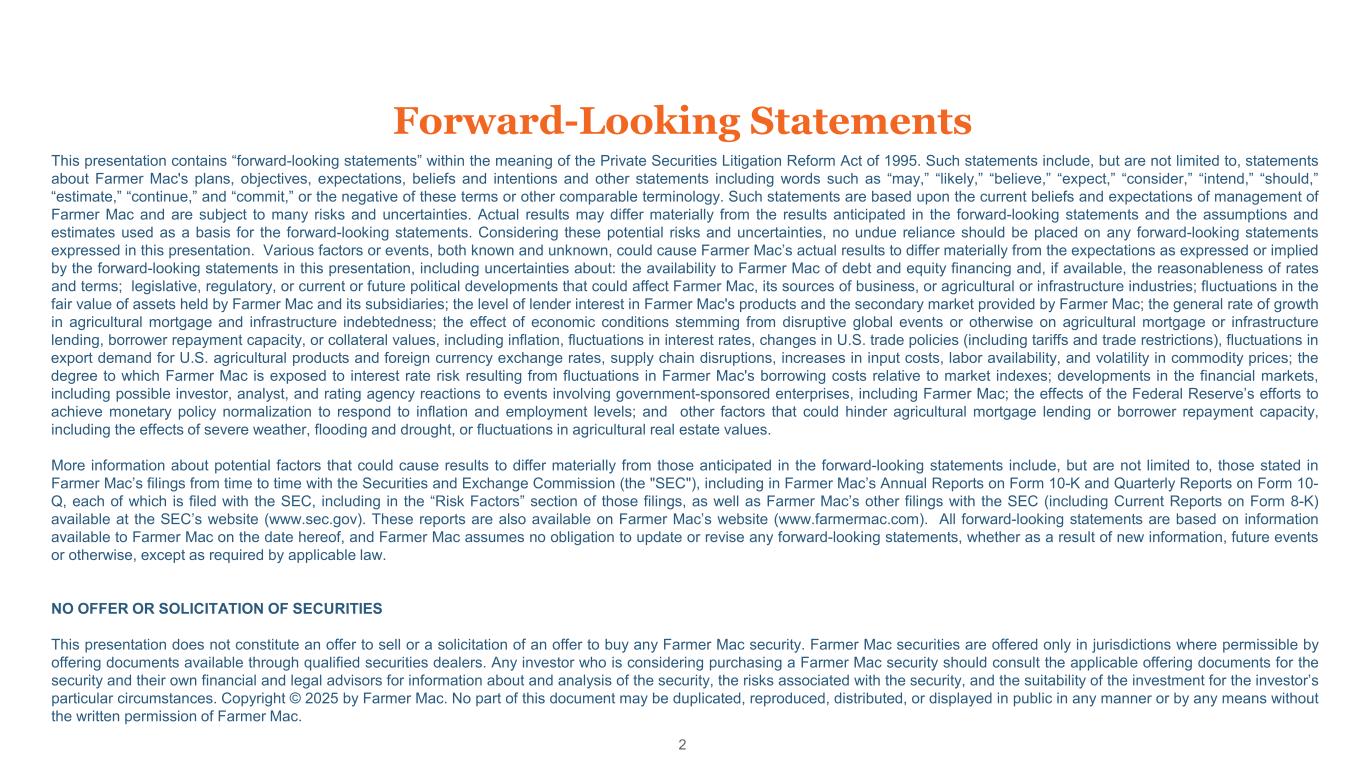 Forward-Looking Statements 2 This presentation contains “forward-looking statements” within the meaning of the Private Securities Litigation Reform Act of 1995. Such statements include, but are not limited to, statements about Farmer Mac's plans, objectives, expectations, beliefs and intentions and other statements including words such as “may,” “likely,” “believe,” “expect,” “consider,” “intend,” “should,” “estimate,” “continue,” and “commit,” or the negative of these terms or other comparable terminology. Such statements are based upon the current beliefs and expectations of management of Farmer Mac and are subject to many risks and uncertainties. Actual results may differ materially from the results anticipated in the forward-looking statements and the assumptions and estimates used as a basis for the forward-looking statements. Considering these potential risks and uncertainties, no undue reliance should be placed on any forward-looking statements expressed in this presentation. Various factors or events, both known and unknown, could cause Farmer Mac’s actual results to differ materially from the expectations as expressed or implied by the forward-looking statements in this presentation, including uncertainties about: the availability to Farmer Mac of debt and equity financing and, if available, the reasonableness of rates and terms; legislative, regulatory, or current or future political developments that could affect Farmer Mac, its sources of business, or agricultural or infrastructure industries; fluctuations in the fair value of assets held by Farmer Mac and its subsidiaries; the level of lender interest in Farmer Mac's products and the secondary market provided by Farmer Mac; the general rate of growth in agricultural mortgage and infrastructure indebtedness; the effect of economic conditions stemming from disruptive global events or otherwise on agricultural mortgage or infrastructure lending, borrower repayment capacity, or collateral values, including inflation, fluctuations in interest rates, changes in U.S. trade policies (including tariffs and trade restrictions), fluctuations in export demand for U.S. agricultural products and foreign currency exchange rates, supply chain disruptions, increases in input costs, labor availability, and volatility in commodity prices; the degree to which Farmer Mac is exposed to interest rate risk resulting from fluctuations in Farmer Mac's borrowing costs relative to market indexes; developments in the financial markets, including possible investor, analyst, and rating agency reactions to events involving government-sponsored enterprises, including Farmer Mac; the effects of the Federal Reserve’s efforts to achieve monetary policy normalization to respond to inflation and employment levels; and other factors that could hinder agricultural mortgage lending or borrower repayment capacity, including the effects of severe weather, flooding and drought, or fluctuations in agricultural real estate values. More information about potential factors that could cause results to differ materially from those anticipated in the forward-looking statements include, but are not limited to, those stated in Farmer Mac’s filings from time to time with the Securities and Exchange Commission (the "SEC"), including in Farmer Mac’s Annual Reports on Form 10-K and Quarterly Reports on Form 10- Q, each of which is filed with the SEC, including in the “Risk Factors” section of those filings, as well as Farmer Mac’s other filings with the SEC (including Current Reports on Form 8-K) available at the SEC’s website (www.sec.gov). These reports are also available on Farmer Mac’s website (www.farmermac.com). All forward-looking statements are based on information available to Farmer Mac on the date hereof, and Farmer Mac assumes no obligation to update or revise any forward-looking statements, whether as a result of new information, future events or otherwise, except as required by applicable law. NO OFFER OR SOLICITATION OF SECURITIES This presentation does not constitute an offer to sell or a solicitation of an offer to buy any Farmer Mac security. Farmer Mac securities are offered only in jurisdictions where permissible by offering documents available through qualified securities dealers. Any investor who is considering purchasing a Farmer Mac security should consult the applicable offering documents for the security and their own financial and legal advisors for information about and analysis of the security, the risks associated with the security, and the suitability of the investment for the investor’s particular circumstances. Copyright © 2025 by Farmer Mac. No part of this document may be duplicated, reproduced, distributed, or displayed in public in any manner or by any means without the written permission of Farmer Mac.