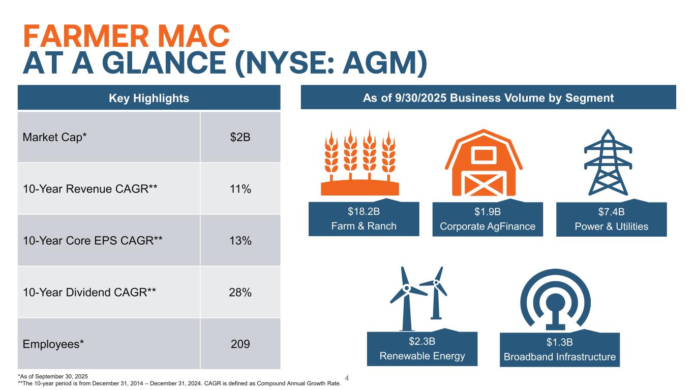 Use of Non-GAAP Financial Measures 3 This presentation is for general informational purposes only, is current only as of September 30, 2025 and should be read in conjunction with Farmer Mac’s Quarterly Report on Form 10-Q filed with the SEC on November 3, 2025. In the accompanying analysis of its financial information, Farmer Mac uses the following non-GAAP financial measures: core earnings, core earnings per share, and net effective spread. Farmer Mac uses these non-GAAP measures to measure corporate economic performance and develop financial plans because, in management's view, they are useful alternative measures in understanding Farmer Mac's economic performance, transaction economics, and business trends. The non-GAAP financial measures that Farmer Mac uses may not be comparable to similarly labeled non-GAAP financial measures disclosed by other companies. Farmer Mac's disclosure of these non-GAAP financial measures is intended to be supplemental in nature and is not meant to be considered in isolation from, as a substitute for, or as more important than, the related financial information prepared in accordance with GAAP. For a reconciliation of core earnings to GAAP net income attributable to common stockholders and a reconciliation of net effective spread to GAAP net interest income, please refer to pages 23-24 of the Appendix. Core earnings and core earnings per share principally differ from net income attributable to common stockholders and earnings per common share, respectively, by excluding the effects of fair value fluctuations. These fluctuations are not expected to have a cumulative net impact on Farmer Mac's financial condition or results of operations reported in accordance with GAAP if the related financial instruments are held to maturity, as is expected. Core earnings and core earnings per share also differ from net income attributable to common stockholders and earnings per common share, respectively, by excluding specified infrequent or unusual transactions that Farmer Mac believes are not indicative of future operating results and that may not reflect the trends and economic financial performance of Farmer Mac's core business. Farmer Mac uses net effective spread to measure the net spread Farmer Mac earns between its interest-earning assets and the related net funding costs of these assets. Net effective spread differs from net interest income and net interest yield because it excludes: (1) the interest income and interest expense associated with the consolidated trusts and the average balance of the loans underlying these trusts; and (2) the fair value changes of financial derivatives and the corresponding assets or liabilities designated in fair value hedge accounting relationships. Net effective spread also principally differs from net interest income and net interest yield because it includes the accrual of income and expense related to the contractual amounts due on financial derivatives that are not designated in hedge accounting relationships ("undesignated financial derivatives") and the net effects of terminations or net settlements on financial derivatives, which consists of: the net effects of cash settlements on agency forward contracts on the debt of other GSEs and U.S. Treasury security futures that we use as short-term economic hedges on the issuance of debt; and the net effects of initial cash payments that Farmer Mac receives upon the inception of certain swaps.