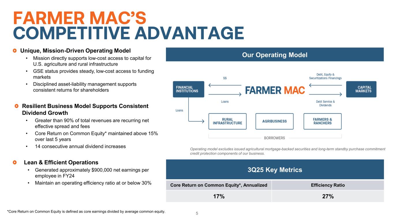 4 FARMER MAC AT A GLANCE (NYSE: AGM) Key Highlights Market Cap* $2B 10-Year Revenue CAGR** 11% 10-Year Core EPS CAGR** 13% 10-Year Dividend CAGR** 28% Employees* 209 $18.2B Farm & Ranch $1.9B Corporate AgFinance $7.4B Power & Utilities $2.3B Renewable Energy $1.3B Broadband Infrastructure As of 9/30/2025 Business Volume by Segment *As of September 30, 2025 **The 10-year period is from December 31, 2014 – December 31, 2024. CAGR is defined as Compound Annual Growth Rate.