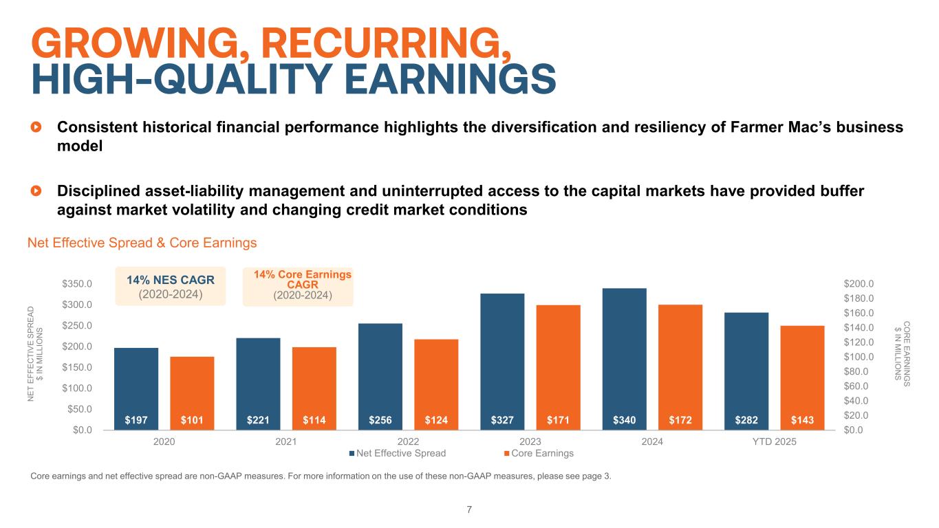 Over the past 10 years, Farmer Mac’s revenue has consistently grown through a variety of different economic cycles, with revenue growth being driven by: • Strong underlying fundamentals and resilient business model • Low-cost access to debt capital markets and disciplined asset-liability management strategies • Diversified lines of business • Consistent credit underwriting standards and policies 6 CONSISTENT REVENUE GROWTH 10 Year CAGR Farmer Mac 11.2% S&P 500 4.9% S&P 500 Financials 5.3% *Revenue performance is indexed at $100 million in 2013 to help provide a better comparison of the performance of Farmer Mac, the S&P 500, and the S&P 500 Financials Index. 0 1 2 3 4 5 6 $0 $50 $100 $150 $200 $250 $300 $350 $400 $450 2014 2015 2016 2017 2018 2019 2020 2021 2022 2023 2024 Fe d Fu nd s Ef fe ct iv e R at e (% ) R ev en ue P er fo rm an ce Indexed Revenue Performance* AGM S&P 500 S&P 500-40 Fed Fund Rate