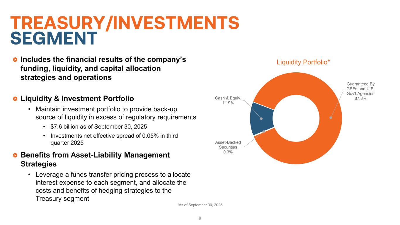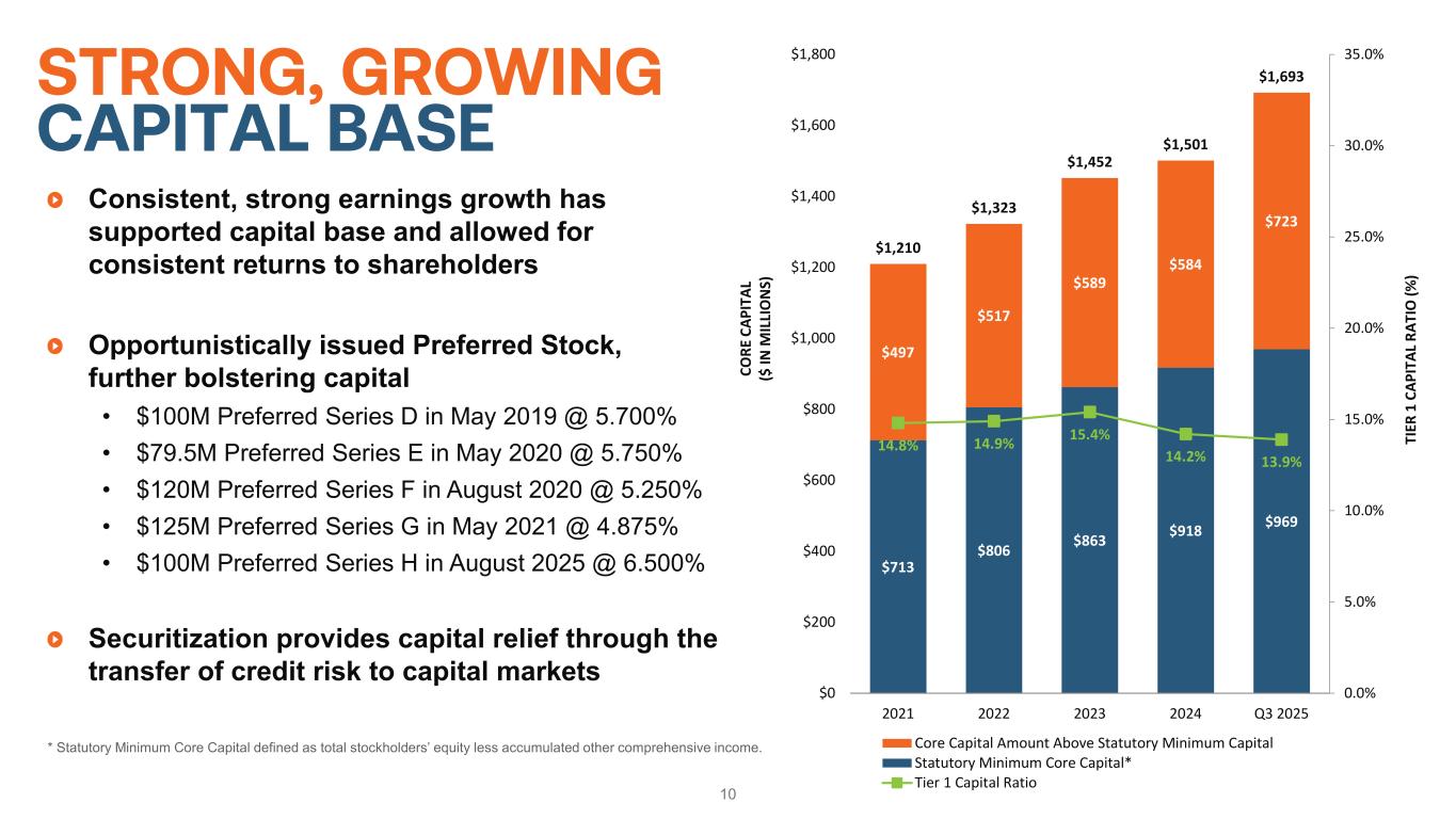 9 TREASURY/INVESTMENTS SEGMENT *As of September 30, 2025 Includes the financial results of the company’s funding, liquidity, and capital allocation strategies and operations Liquidity & Investment Portfolio • Maintain investment portfolio to provide back-up source of liquidity in excess of regulatory requirements • $7.6 billion as of September 30, 2025 • Investments net effective spread of 0.05% in third quarter 2025 Benefits from Asset-Liability Management Strategies • Leverage a funds transfer pricing process to allocate interest expense to each segment, and allocate the costs and benefits of hedging strategies to the Treasury segment Cash & Equiv. 11.9% Guaranteed By GSEs and U.S. Gov't Agencies 87.8% Asset-Backed Securities 0.3% Liquidity Portfolio*