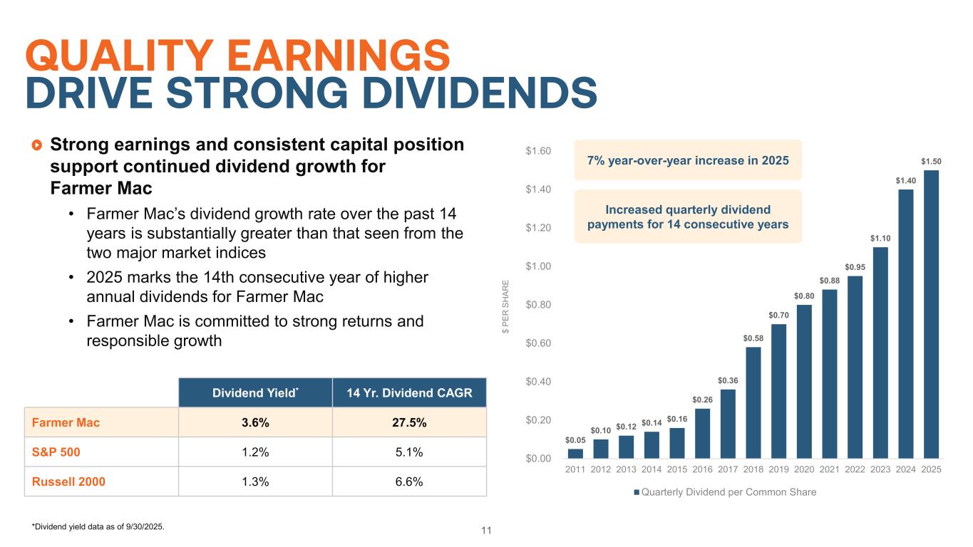Consistent, strong earnings growth has supported capital base and allowed for consistent returns to shareholders Opportunistically issued Preferred Stock, further bolstering capital • $100M Preferred Series D in May 2019 @ 5.700% • $79.5M Preferred Series E in May 2020 @ 5.750% • $120M Preferred Series F in August 2020 @ 5.250% • $125M Preferred Series G in May 2021 @ 4.875% • $100M Preferred Series H in August 2025 @ 6.500% Securitization provides capital relief through the transfer of credit risk to capital markets 10 STRONG, GROWING CAPITAL BASE * Statutory Minimum Core Capital defined as total stockholders’ equity less accumulated other comprehensive income. $713 $806 $863 $918 $969 $497 $517 $589 $584 $723 $1,210 $1,323 $1,452 $1,501 $1,693 14.8% 14.9% 15.4% 14.2% 13.9% 0.0% 5.0% 10.0% 15.0% 20.0% 25.0% 30.0% 35.0% $0 $200 $400 $600 $800 $1,000 $1,200 $1,400 $1,600 $1,800 2021 2022 2023 2024 Q3 2025 TI ER 1 C AP IT AL R AT IO (% ) CO RE C AP IT AL ($ IN M IL LI O N S) Core Capital Amount Above Statutory Minimum Capital Statutory Minimum Core Capital* Tier 1 Capital Ratio