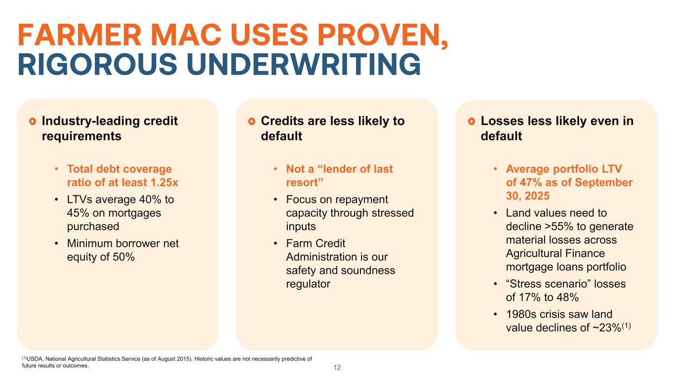 11 QUALITY EARNINGS DRIVE STRONG DIVIDENDS Strong earnings and consistent capital position support continued dividend growth for Farmer Mac • Farmer Mac’s dividend growth rate over the past 14 years is substantially greater than that seen from the two major market indices • 2025 marks the 14th consecutive year of higher annual dividends for Farmer Mac • Farmer Mac is committed to strong returns and responsible growth Dividend Yield* 14 Yr. Dividend CAGR Farmer Mac 3.6% 27.5% S&P 500 1.2% 5.1% Russell 2000 1.3% 6.6% $0.05 $0.10 $0.12 $0.14 $0.16 $0.26 $0.36 $0.58 $0.70 $0.80 $0.88 $0.95 $1.10 $1.40 $1.50 $0.00 $0.20 $0.40 $0.60 $0.80 $1.00 $1.20 $1.40 $1.60 2011 2012 2013 2014 2015 2016 2017 2018 2019 2020 2021 2022 2023 2024 2025 $ PE R S H AR E Quarterly Dividend per Common Share 7% year-over-year increase in 2025 Increased quarterly dividend payments for 14 consecutive years *Dividend yield data as of 9/30/2025.