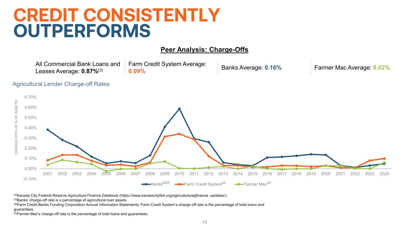12 FARMER MAC USES PROVEN, RIGOROUS UNDERWRITING Industry-leading credit requirements • Total debt coverage ratio of at least 1.25x • LTVs average 40% to 45% on mortgages purchased • Minimum borrower net equity of 50% Credits are less likely to default • Not a “lender of last resort” • Focus on repayment capacity through stressed inputs • Farm Credit Administration is our safety and soundness regulator Losses less likely even in default • Average portfolio LTV of 47% as of September 30, 2025 • Land values need to decline >55% to generate material losses across Agricultural Finance mortgage loans portfolio • “Stress scenario” losses of 17% to 48% • 1980s crisis saw land value declines of ~23%(1) (1)USDA, National Agricultural Statistics Service (as of August 2015). Historic values are not necessarily predictive of future results or outcomes.