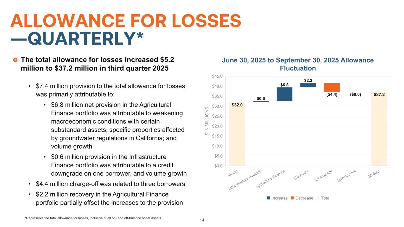 CREDIT CONSISTENTLY OUTPERFORMS 13 All Commercial Bank Loans and Leases Average: 0.87%(3) Farm Credit System Average: 0.09% Banks Average: 0.16% Farmer Mac Average: 0.02% Peer Analysis: Charge-Offs -0.10% 0.00% 0.10% 0.20% 0.30% 0.40% 0.50% 0.60% 0.70% 2001 2002 2003 2004 2005 2006 2007 2008 2009 2010 2011 2012 2013 2014 2015 2016 2017 2018 2019 2020 2021 2022 2023 2024 C H AR G E- O FF S AS % O F AS SE TS Agricultural Lender Charge-off Rates Banks Farm Credit System Farmer Mac(4)(2)(3) (5) (2)Kansas City Federal Reserve Agriculture Finance Databook (https://www.kansascityfed.org/agriculture/agfinance -updates/). (3)Banks’ charge-off rate is a percentage of agricultural loan assets. (4)Farm Credit Banks Funding Corporation Annual Information Statements; Farm Credit System’s charge-off rate is the percentage of total loans and guarantees. (5)Farmer Mac’s charge-off rate is the percentage of total loans and guarantees.