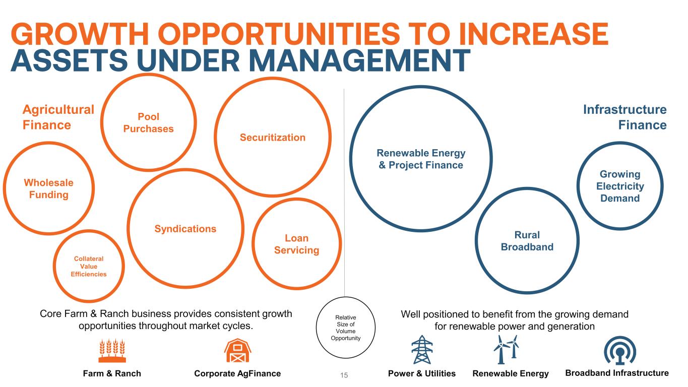 14 ALLOWANCE FOR LOSSES —QUARTERLY* The total allowance for losses increased $5.2 million to $37.2 million in third quarter 2025 • $7.4 million provision to the total allowance for losses was primarily attributable to: • $6.8 million net provision in the Agricultural Finance portfolio was attributable to weakening macroeconomic conditions with certain substandard assets; specific properties affected by groundwater regulations in California; and volume growth • $0.6 million provision in the Infrastructure Finance portfolio was attributable to a credit downgrade on one borrower, and volume growth • $4.4 million charge-off was related to three borrowers • $2.2 million recovery in the Agricultural Finance portfolio partially offset the increases to the provision $0.6 $6.8 $2.2 ($4.4) ($0.0) $32.0 $37.2 $ IN M IL LI O N S $0.0 $5.0 $10.0 $15.0 $20.0 $25.0 $30.0 $35.0 $40.0 $45.0 June 30, 2025 to September 30, 2025 Allowance Fluctuation Increase Decrease Total *Represents the total allowance for losses, inclusive of all on- and off-balance sheet assets