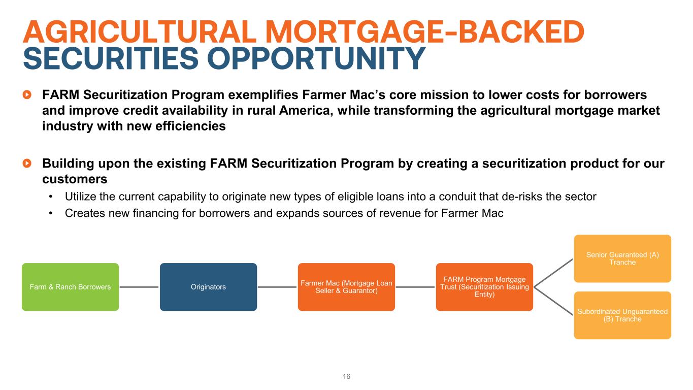GROWTH OPPORTUNITIES TO INCREASE ASSETS UNDER MANAGEMENT 15Farm & Ranch Corporate AgFinance Core Farm & Ranch business provides consistent growth opportunities throughout market cycles. Well positioned to benefit from the growing demand for renewable power and generation Agricultural Finance Infrastructure Finance Renewable Energy Relative Size of Volume Opportunity Securitization Pool Purchases Syndications Wholesale Funding Loan Servicing Collateral Value Efficiencies Renewable Energy & Project Finance Rural Broadband Growing Electricity Demand Power & Utilities Broadband Infrastructure