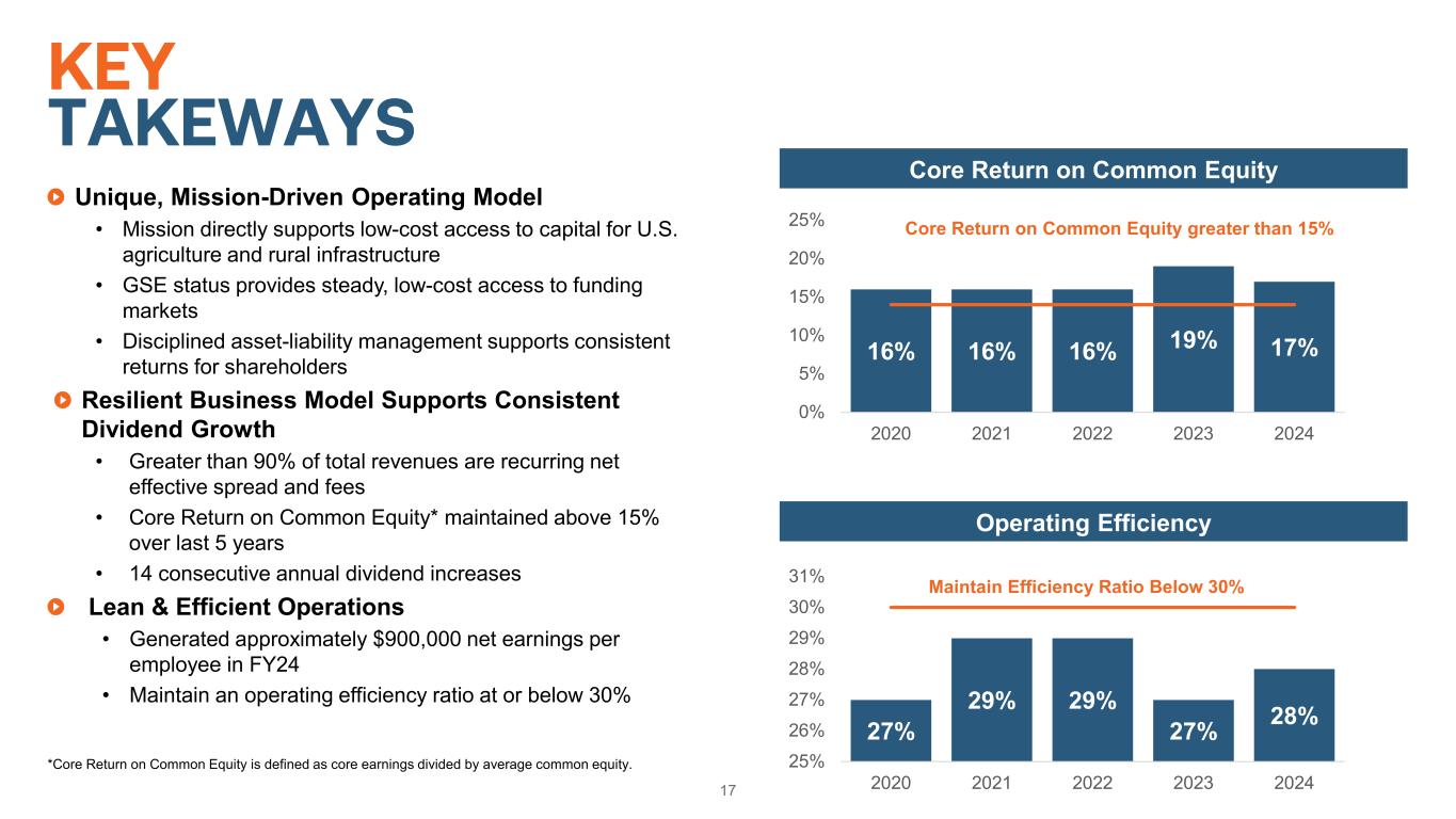 Unique, Mission-Driven Operating Model • Mission directly supports low-cost access to capital for U.S. agriculture and rural infrastructure • GSE status provides steady, low-cost access to funding markets • Disciplined asset-liability management supports consistent returns for shareholders Resilient Business Model Supports Consistent Dividend Growth • Greater than 90% of total revenues are recurring net effective spread and fees • Core Return on Common Equity* maintained above 15% over last 5 years • 14 consecutive annual dividend increases Lean & Efficient Operations • Generated approximately $900,000 net earnings per employee in FY24 • Maintain an operating efficiency ratio at or below 30% 17 KEY TAKEWAYS 27% 29% 29% 27% 28% 25% 26% 27% 28% 29% 30% 31% 2020 2021 2022 2023 2024 Maintain Efficiency Ratio Below 30% 16% 16% 16% 19% 17% 0% 5% 10% 15% 20% 25% 2020 2021 2022 2023 2024 Core Return on Common Equity greater than 15% Core Return on Common Equity Operating Efficiency *Core Return on Common Equity is defined as core earnings divided by average common equity.