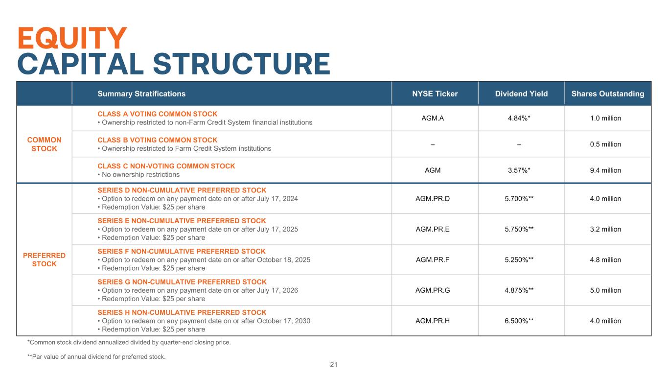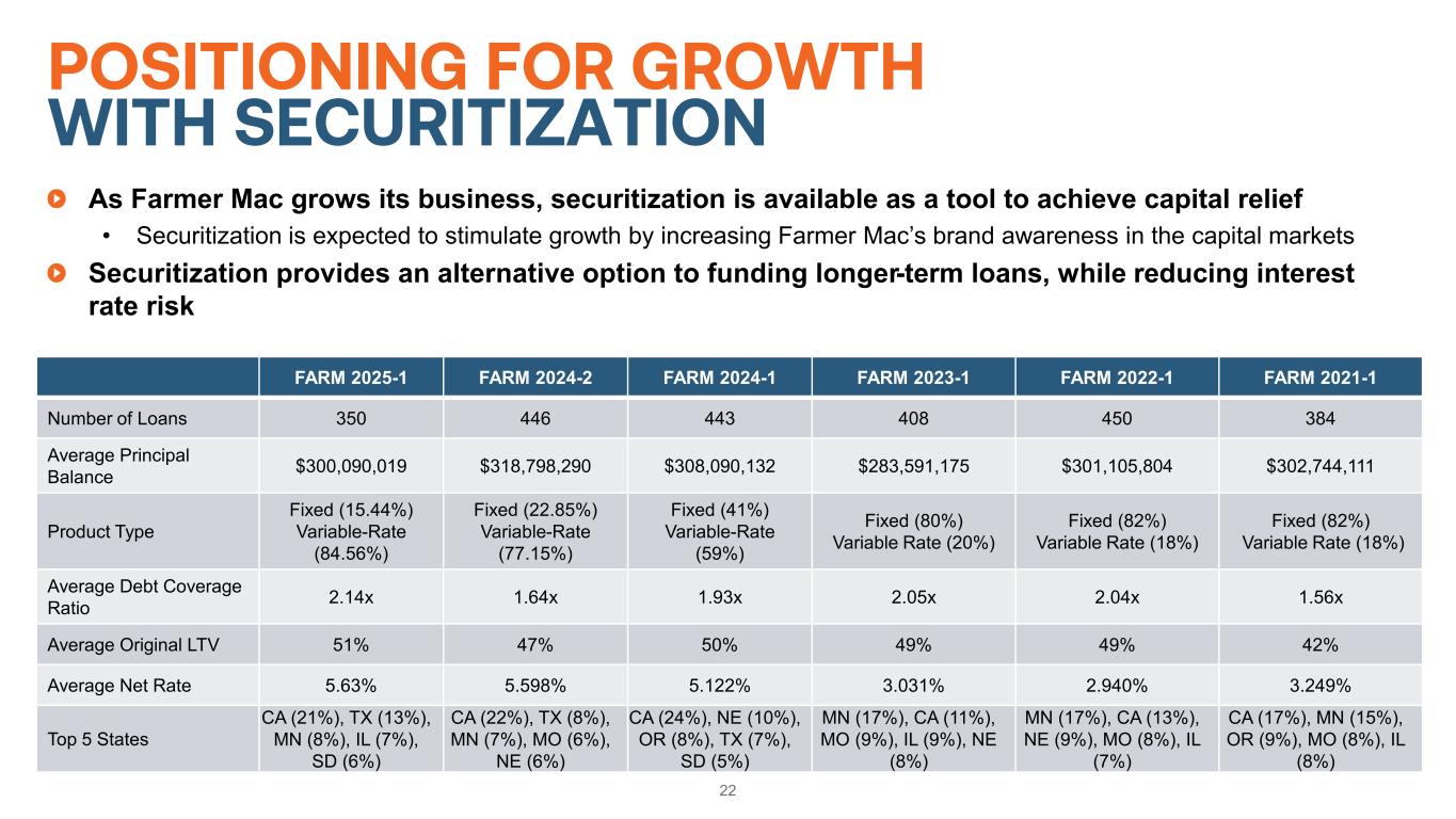 21 EQUITY CAPITAL STRUCTURE *Common stock dividend annualized divided by quarter-end closing price. **Par value of annual dividend for preferred stock. Summary Stratifications NYSE Ticker Dividend Yield Shares Outstanding COMMON STOCK CLASS A VOTING COMMON STOCK • Ownership restricted to non-Farm Credit System financial institutions AGM.A 4.84%* 1.0 million CLASS B VOTING COMMON STOCK • Ownership restricted to Farm Credit System institutions – – 0.5 million CLASS C NON-VOTING COMMON STOCK • No ownership restrictions AGM 3.57%* 9.4 million PREFERRED STOCK SERIES D NON-CUMULATIVE PREFERRED STOCK • Option to redeem on any payment date on or after July 17, 2024 • Redemption Value: $25 per share AGM.PR.D 5.700%** 4.0 million SERIES E NON-CUMULATIVE PREFERRED STOCK • Option to redeem on any payment date on or after July 17, 2025 • Redemption Value: $25 per share AGM.PR.E 5.750%** 3.2 million SERIES F NON-CUMULATIVE PREFERRED STOCK • Option to redeem on any payment date on or after October 18, 2025 • Redemption Value: $25 per share AGM.PR.F 5.250%** 4.8 million SERIES G NON-CUMULATIVE PREFERRED STOCK • Option to redeem on any payment date on or after July 17, 2026 • Redemption Value: $25 per share AGM.PR.G 4.875%** 5.0 million SERIES H NON-CUMULATIVE PREFERRED STOCK • Option to redeem on any payment date on or after October 17, 2030 • Redemption Value: $25 per share AGM.PR.H 6.500%** 4.0 million