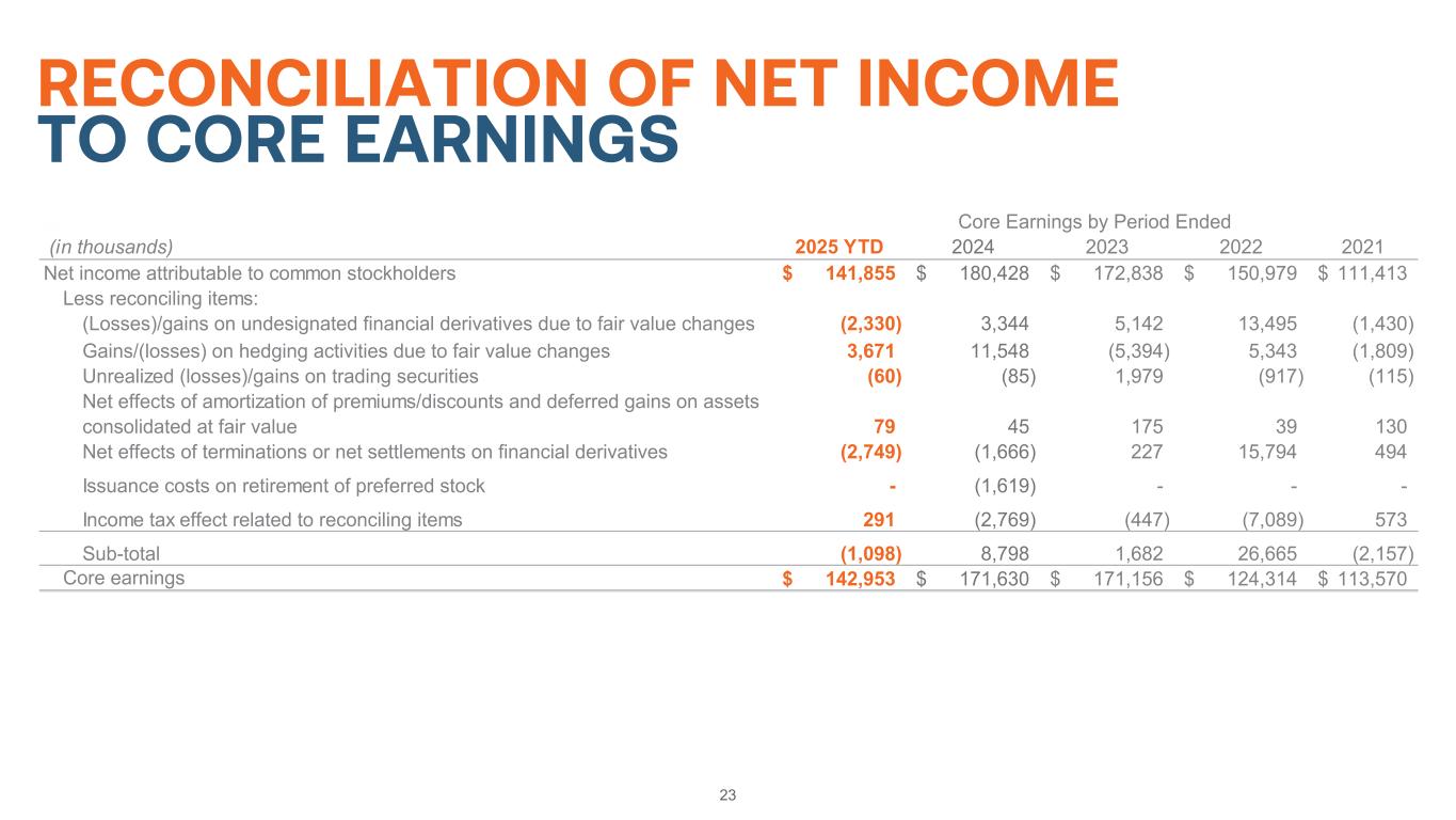 23 RECONCILIATION OF NET INCOME TO CORE EARNINGS (in thousands) 2025 YTD 2024 2023 2022 2021 Net income attributable to common stockholders 141,855$ 180,428$ 172,838$ 150,979$ 111,413$ Less reconciling items: (Losses)/gains on undesignated financial derivatives due to fair value changes (2,330) 3,344 5,142 13,495 (1,430) Gains/(losses) on hedging activities due to fair value changes 3,671 11,548 (5,394) 5,343 (1,809) Unrealized (losses)/gains on trading securities (60) (85) 1,979 (917) (115) Net effects of amortization of premiums/discounts and deferred gains on assets consolidated at fair value 79 45 175 39 130 Net effects of terminations or net settlements on financial derivatives (2,749) (1,666) 227 15,794 494 Issuance costs on retirement of preferred stock - (1,619) - - - Income tax effect related to reconciling items 291 (2,769) (447) (7,089) 573 Sub-total (1,098) 8,798 1,682 26,665 (2,157) Core earnings 142,953$ 171,630$ 171,156$ 124,314$ 113,570$ Core Earnings by Period Ended