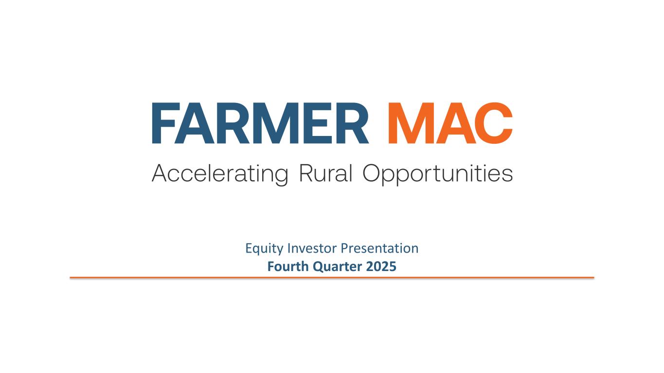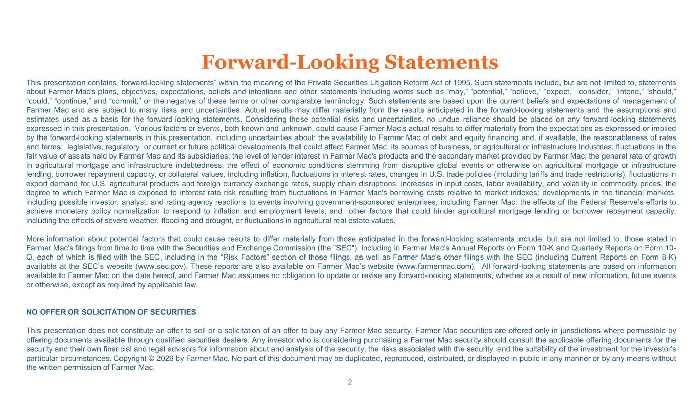 Forward-Looking Statements 2 This presentation contains “forward-looking statements” within the meaning of the Private Securities Litigation Reform Act of 1995. Such statements include, but are not limited to, statements about Farmer Mac's plans, objectives, expectations, beliefs and intentions and other statements including words such as “may,” “potential,” “believe,” “expect,” “consider,” “intend,” “should,” “could,” “continue,” and “commit,” or the negative of these terms or other comparable terminology. Such statements are based upon the current beliefs and expectations of management of Farmer Mac and are subject to many risks and uncertainties. Actual results may differ materially from the results anticipated in the forward-looking statements and the assumptions and estimates used as a basis for the forward-looking statements. Considering these potential risks and uncertainties, no undue reliance should be placed on any forward-looking statements expressed in this presentation. Various factors or events, both known and unknown, could cause Farmer Mac’s actual results to differ materially from the expectations as expressed or implied by the forward-looking statements in this presentation, including uncertainties about: the availability to Farmer Mac of debt and equity financing and, if available, the reasonableness of rates and terms; legislative, regulatory, or current or future political developments that could affect Farmer Mac, its sources of business, or agricultural or infrastructure industries; fluctuations in the fair value of assets held by Farmer Mac and its subsidiaries; the level of lender interest in Farmer Mac's products and the secondary market provided by Farmer Mac; the general rate of growth in agricultural mortgage and infrastructure indebtedness; the effect of economic conditions stemming from disruptive global events or otherwise on agricultural mortgage or infrastructure lending, borrower repayment capacity, or collateral values, including inflation, fluctuations in interest rates, changes in U.S. trade policies (including tariffs and trade restrictions), fluctuations in export demand for U.S. agricultural products and foreign currency exchange rates, supply chain disruptions, increases in input costs, labor availability, and volatility in commodity prices; the degree to which Farmer Mac is exposed to interest rate risk resulting from fluctuations in Farmer Mac's borrowing costs relative to market indexes; developments in the financial markets, including possible investor, analyst, and rating agency reactions to events involving government-sponsored enterprises, including Farmer Mac; the effects of the Federal Reserve’s efforts to achieve monetary policy normalization to respond to inflation and employment levels; and other factors that could hinder agricultural mortgage lending or borrower repayment capacity, including the effects of severe weather, flooding and drought, or fluctuations in agricultural real estate values. More information about potential factors that could cause results to differ materially from those anticipated in the forward-looking statements include, but are not limited to, those stated in Farmer Mac’s filings from time to time with the Securities and Exchange Commission (the "SEC"), including in Farmer Mac’s Annual Reports on Form 10-K and Quarterly Reports on Form 10- Q, each of which is filed with the SEC, including in the “Risk Factors” section of those filings, as well as Farmer Mac’s other filings with the SEC (including Current Reports on Form 8-K) available at the SEC’s website (www.sec.gov). These reports are also available on Farmer Mac’s website (www.farmermac.com). All forward-looking statements are based on information available to Farmer Mac on the date hereof, and Farmer Mac assumes no obligation to update or revise any forward-looking statements, whether as a result of new information, future events or otherwise, except as required by applicable law. NO OFFER OR SOLICITATION OF SECURITIES This presentation does not constitute an offer to sell or a solicitation of an offer to buy any Farmer Mac security. Farmer Mac securities are offered only in jurisdictions where permissible by offering documents available through qualified securities dealers. Any investor who is considering purchasing a Farmer Mac security should consult the applicable offering documents for the security and their own financial and legal advisors for information about and analysis of the security, the risks associated with the security, and the suitability of the investment for the investor’s particular circumstances. Copyright © 2026 by Farmer Mac. No part of this document may be duplicated, reproduced, distributed, or displayed in public in any manner or by any means without the written permission of Farmer Mac.