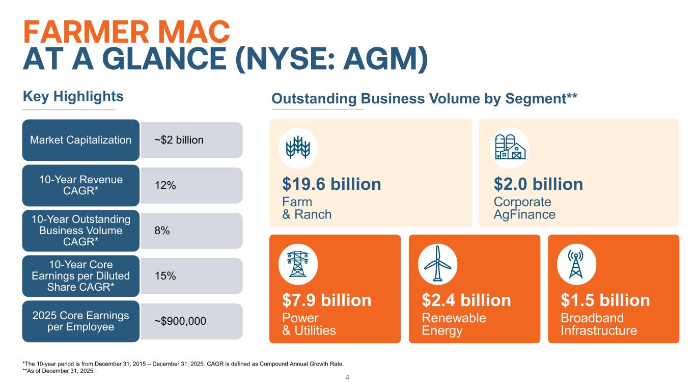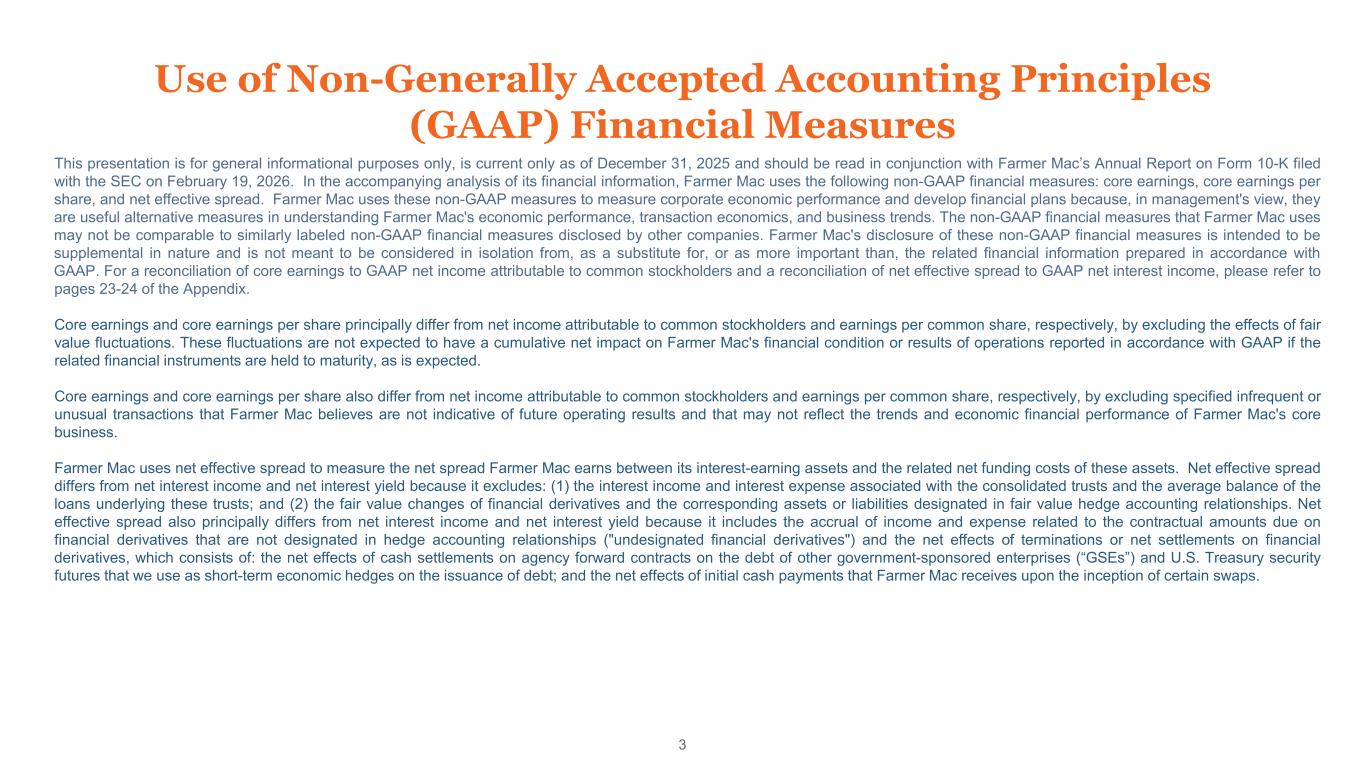 Use of Non-Generally Accepted Accounting Principles (GAAP) Financial Measures 3 This presentation is for general informational purposes only, is current only as of December 31, 2025 and should be read in conjunction with Farmer Mac’s Annual Report on Form 10-K filed with the SEC on February 19, 2026. In the accompanying analysis of its financial information, Farmer Mac uses the following non-GAAP financial measures: core earnings, core earnings per share, and net effective spread. Farmer Mac uses these non-GAAP measures to measure corporate economic performance and develop financial plans because, in management's view, they are useful alternative measures in understanding Farmer Mac's economic performance, transaction economics, and business trends. The non-GAAP financial measures that Farmer Mac uses may not be comparable to similarly labeled non-GAAP financial measures disclosed by other companies. Farmer Mac's disclosure of these non-GAAP financial measures is intended to be supplemental in nature and is not meant to be considered in isolation from, as a substitute for, or as more important than, the related financial information prepared in accordance with GAAP. For a reconciliation of core earnings to GAAP net income attributable to common stockholders and a reconciliation of net effective spread to GAAP net interest income, please refer to pages 23-24 of the Appendix. Core earnings and core earnings per share principally differ from net income attributable to common stockholders and earnings per common share, respectively, by excluding the effects of fair value fluctuations. These fluctuations are not expected to have a cumulative net impact on Farmer Mac's financial condition or results of operations reported in accordance with GAAP if the related financial instruments are held to maturity, as is expected. Core earnings and core earnings per share also differ from net income attributable to common stockholders and earnings per common share, respectively, by excluding specified infrequent or unusual transactions that Farmer Mac believes are not indicative of future operating results and that may not reflect the trends and economic financial performance of Farmer Mac's core business. Farmer Mac uses net effective spread to measure the net spread Farmer Mac earns between its interest-earning assets and the related net funding costs of these assets. Net effective spread differs from net interest income and net interest yield because it excludes: (1) the interest income and interest expense associated with the consolidated trusts and the average balance of the loans underlying these trusts; and (2) the fair value changes of financial derivatives and the corresponding assets or liabilities designated in fair value hedge accounting relationships. Net effective spread also principally differs from net interest income and net interest yield because it includes the accrual of income and expense related to the contractual amounts due on financial derivatives that are not designated in hedge accounting relationships ("undesignated financial derivatives") and the net effects of terminations or net settlements on financial derivatives, which consists of: the net effects of cash settlements on agency forward contracts on the debt of other government-sponsored enterprises (“GSEs”) and U.S. Treasury security futures that we use as short-term economic hedges on the issuance of debt; and the net effects of initial cash payments that Farmer Mac receives upon the inception of certain swaps.