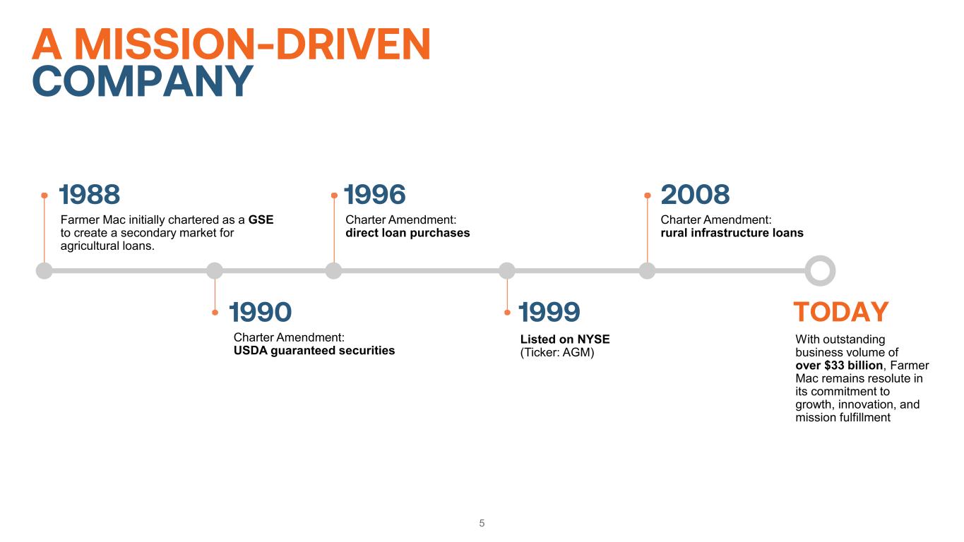 4 FARMER MAC AT A GLANCE (NYSE: AGM) *The 10-year period is from December 31, 2015 – December 31, 2025. CAGR is defined as Compound Annual Growth Rate. **As of December 31, 2025. $19.6 billion Farm & Ranch $2.0 billion Corporate AgFinance $7.9 billion Power & Utilities $2.4 billion Renewable Energy $1.5 billion Broadband Infrastructure Outstanding Business Volume by Segment**Key Highlights ~$2 billionMarket Capitalization 12%10-Year Revenue CAGR* 8% 10-Year Outstanding Business Volume CAGR* 15% 10-Year Core Earnings per Diluted Share CAGR* ~$900,0002025 Core Earnings per Employee