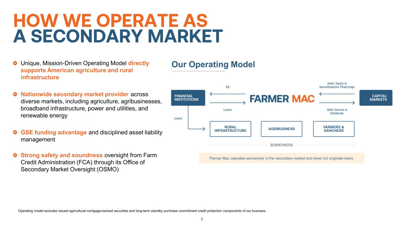 A MISSION-DRIVEN COMPANY 5 TODAY1999 Listed on NYSE (Ticker: AGM) 1990 Charter Amendment: USDA guaranteed securities 1988 Farmer Mac initially chartered as a GSE to create a secondary market for agricultural loans. 1996 Charter Amendment: direct loan purchases 2008 Charter Amendment: rural infrastructure loans With outstanding business volume of over $33 billion, Farmer Mac remains resolute in its commitment to growth, innovation, and mission fulfillment