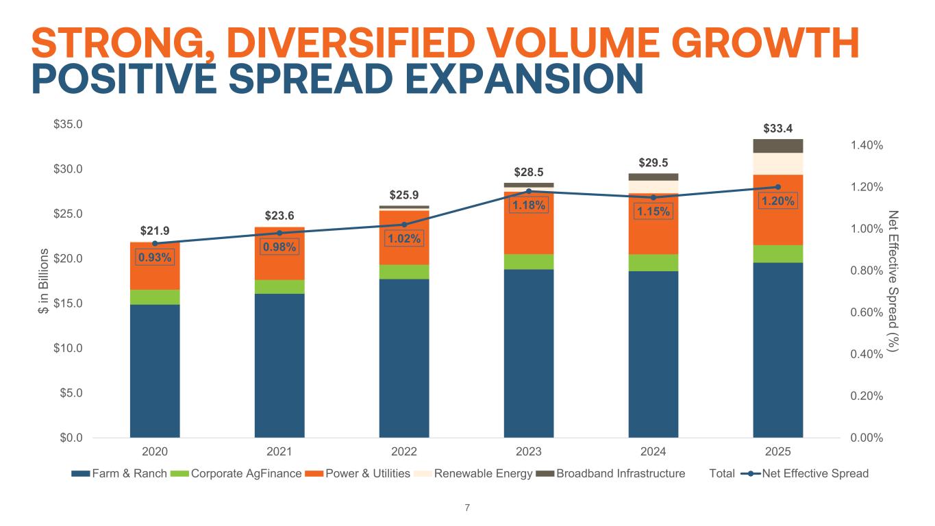 Unique, Mission-Driven Operating Model directly supports American agriculture and rural infrastructure Nationwide secondary market provider across diverse markets, including agriculture, agribusinesses, broadband infrastructure, power and utilities, and renewable energy GSE funding advantage and disciplined asset liability management Strong safety and soundness oversight from Farm Credit Administration (FCA) through its Office of Secondary Market Oversight (OSMO) 6 HOW WE OPERATE AS A SECONDARY MARKET Operating model excludes issued agricultural mortgage-backed securities and long-term standby purchase commitment credit protection components of our business. Our Operating Model