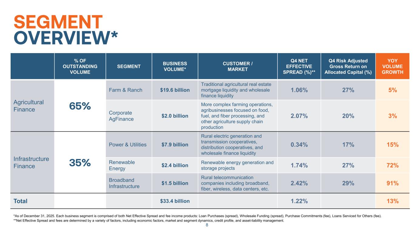 7 STRONG, DIVERSIFIED VOLUME GROWTH POSITIVE SPREAD EXPANSION $21.9 $23.6 $25.9 $28.5 $29.5 $33.4 0.93% 0.98% 1.02% 1.18% 1.15% 1.20% 0.00% 0.20% 0.40% 0.60% 0.80% 1.00% 1.20% 1.40% $0.0 $5.0 $10.0 $15.0 $20.0 $25.0 $30.0 $35.0 2020 2021 2022 2023 2024 2025 N et Effective Spread (% ) $ in B illi on s Farm & Ranch Corporate AgFinance Power & Utilities Renewable Energy Broadband Infrastructure Total Net Effective Spread