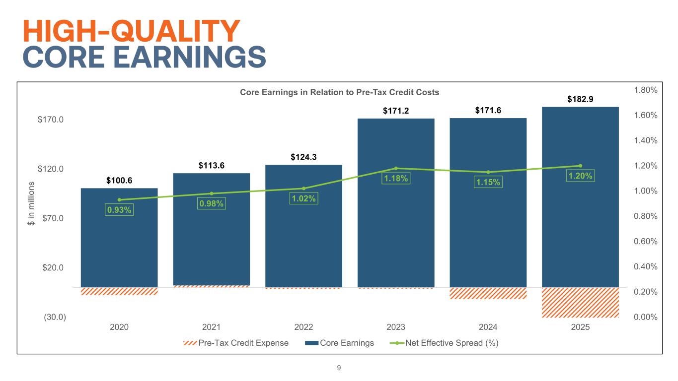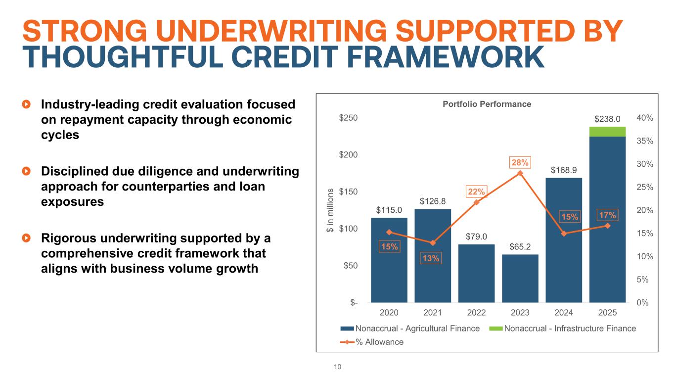 9 HIGH-QUALITY CORE EARNINGS $100.6 $113.6 $124.3 $171.2 $171.6 $182.9 0.93% 0.98% 1.02% 1.18% 1.15% 1.20% 0.00% 0.20% 0.40% 0.60% 0.80% 1.00% 1.20% 1.40% 1.60% 1.80% (30.0) $20.0 $70.0 $120.0 $170.0 2020 2021 2022 2023 2024 2025 $ in m illi on s Core Earnings in Relation to Pre-Tax Credit Costs Pre-Tax Credit Expense Core Earnings Net Effective Spread (%)