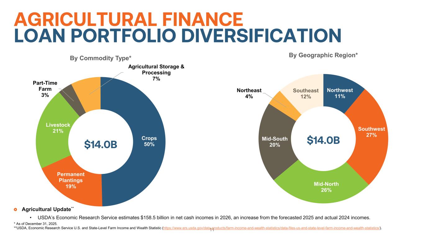 10 STRONG UNDERWRITING SUPPORTED BY THOUGHTFUL CREDIT FRAMEWORK $115.0 $126.8 $79.0 $65.2 $168.9 $238.0 15% 13% 22% 28% 15% 17% 0% 5% 10% 15% 20% 25% 30% 35% 40% $- $50 $100 $150 $200 $250 2020 2021 2022 2023 2024 2025 $ in m illi on s Portfolio Performance Nonaccrual - Agricultural Finance Nonaccrual - Infrastructure Finance % Allowance Industry-leading credit evaluation focused on repayment capacity through economic cycles Disciplined due diligence and underwriting approach for counterparties and loan exposures Rigorous underwriting supported by a comprehensive credit framework that aligns with business volume growth