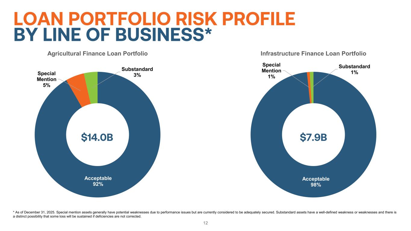 Crops 50% Permanent Plantings 19% Livestock 21% Part-Time Farm 3% Agricultural Storage & Processing 7% By Commodity Type* 11 AGRICULTURAL FINANCE LOAN PORTFOLIO DIVERSIFICATION Northwest 11% Southwest 27% Mid-North 26% Mid-South 20% Northeast 4% Southeast 12% By Geographic Region* $14.0B $14.0B Agricultural Update** • USDA’s Economic Research Service estimates $158.5 billion in net cash incomes in 2026, an increase from the forecasted 2025 and actual 2024 incomes. * As of December 31, 2025. **USDA, Economic Research Service U.S. and State-Level Farm Income and Wealth Statistic (https://www.ers.usda.gov/data-products/farm-income-and-wealth-statistics/data-files-us-and-state-level-farm-income-and-wealth-statistics/).