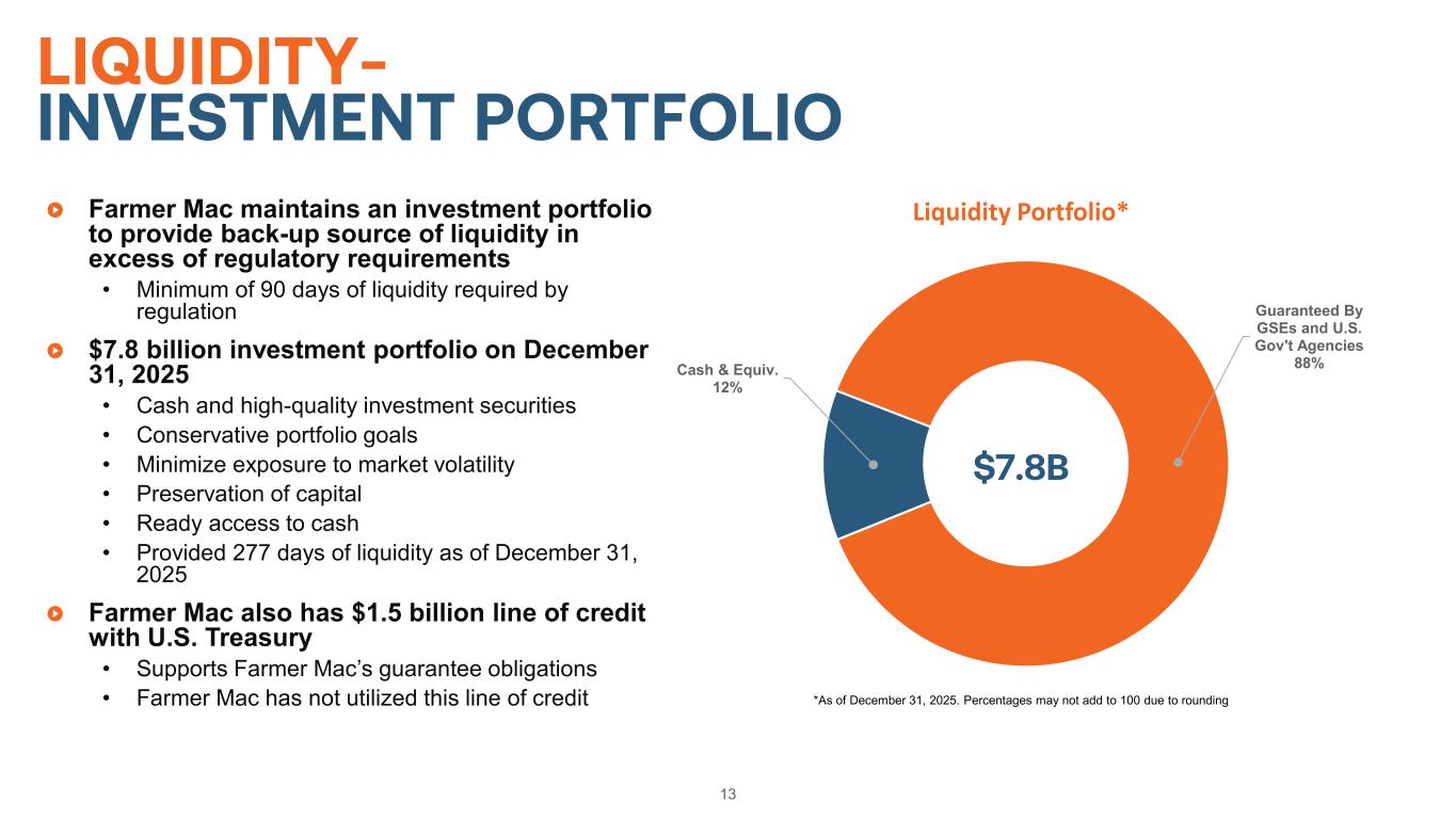 Acceptable 92% Special Mention 5% Substandard 3% Agricultural Finance Loan Portfolio 12 LOAN PORTFOLIO RISK PROFILE BY LINE OF BUSINESS* Acceptable 98% Special Mention 1% Substandard 1% Infrastructure Finance Loan Portfolio $14.0B $7.9B * As of December 31, 2025. Special mention assets generally have potential weaknesses due to performance issues but are currently considered to be adequately secured. Substandard assets have a well-defined weakness or weaknesses and there is a distinct possibility that some loss will be sustained if deficiencies are not corrected.