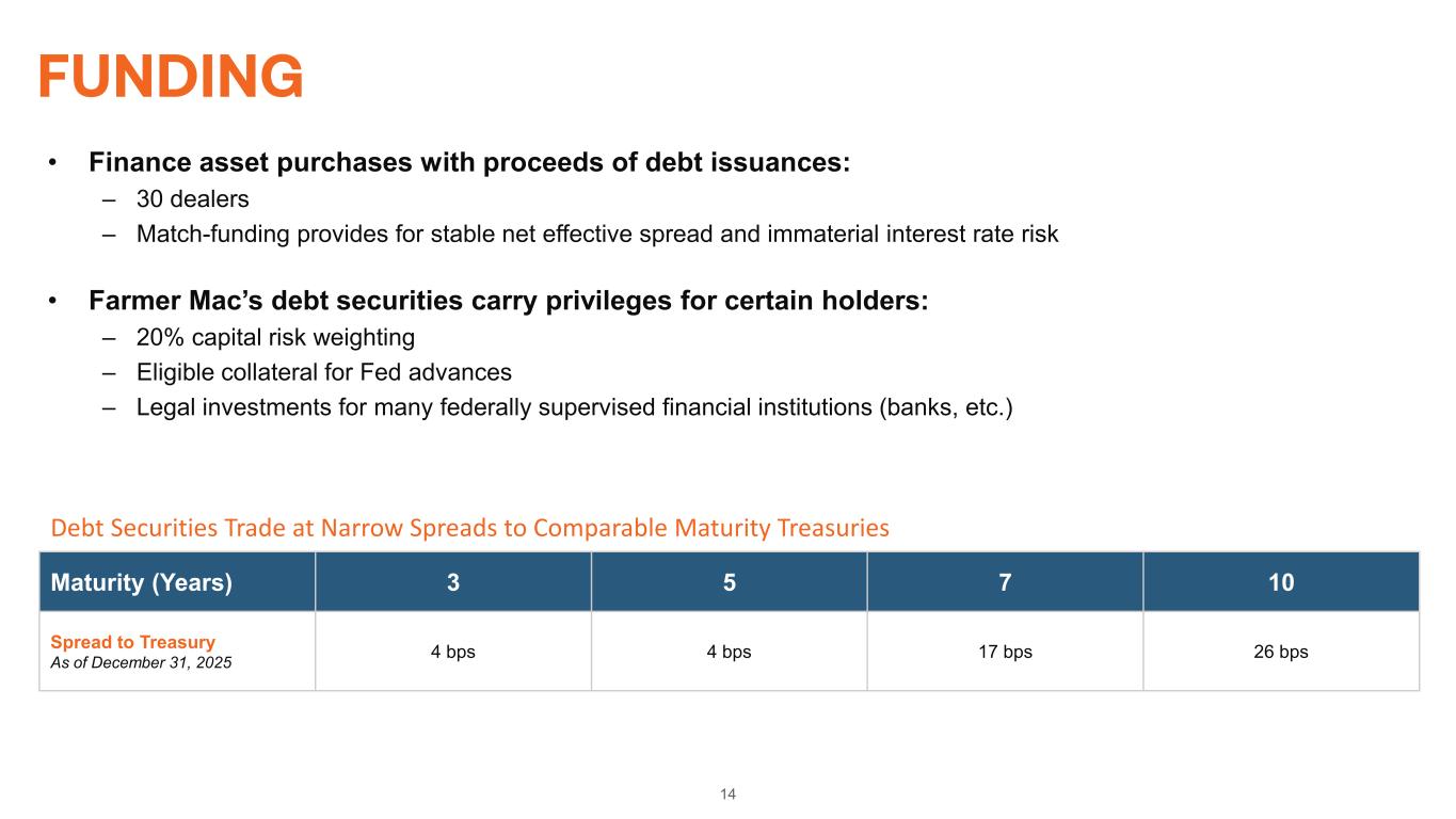 13 LIQUIDITY- INVESTMENT PORTFOLIO Farmer Mac maintains an investment portfolio to provide back-up source of liquidity in excess of regulatory requirements • Minimum of 90 days of liquidity required by regulation $7.8 billion investment portfolio on December 31, 2025 • Cash and high-quality investment securities • Conservative portfolio goals • Minimize exposure to market volatility • Preservation of capital • Ready access to cash • Provided 277 days of liquidity as of December 31, 2025 Farmer Mac also has $1.5 billion line of credit with U.S. Treasury • Supports Farmer Mac’s guarantee obligations • Farmer Mac has not utilized this line of credit Cash & Equiv. 12% Guaranteed By GSEs and U.S. Gov't Agencies 88% Liquidity Portfolio* $7.8B *As of December 31, 2025. Percentages may not add to 100 due to rounding