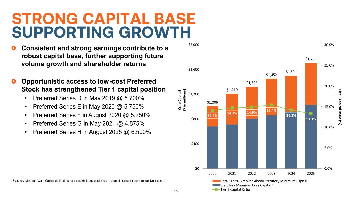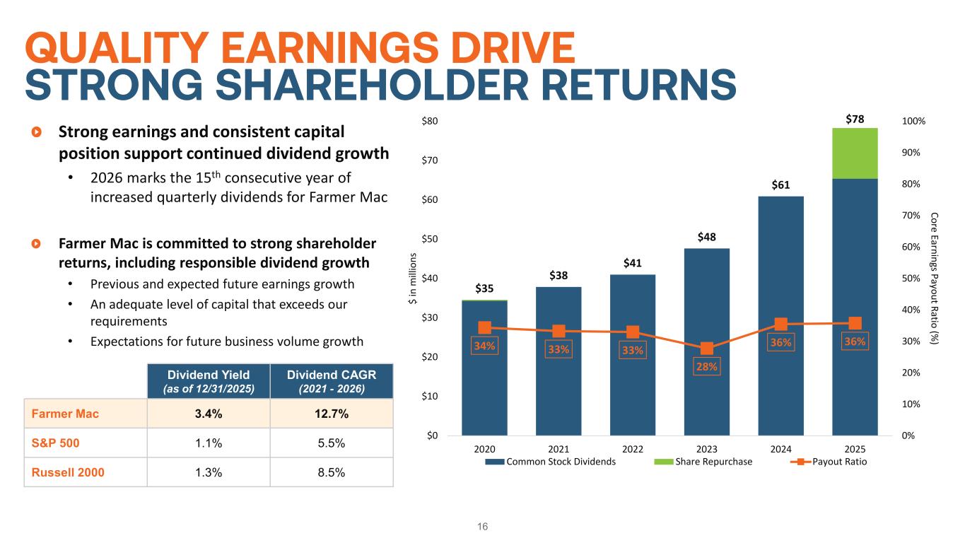 Consistent and strong earnings contribute to a robust capital base, further supporting future volume growth and shareholder returns Opportunistic access to low-cost Preferred Stock has strengthened Tier 1 capital position • Preferred Series D in May 2019 @ 5.700% • Preferred Series E in May 2020 @ 5.750% • Preferred Series F in August 2020 @ 5.250% • Preferred Series G in May 2021 @ 4.875% • Preferred Series H in August 2025 @ 6.500% 15 *Statutory Minimum Core Capital defined as total stockholders’ equity less accumulated other comprehensive income. $1,006 $1,210 $1,323 $1,452 $1,501 $1,706 14.1% 14.7% 14.9% 15.4% 14.2% 13.3% 0.0% 5.0% 10.0% 15.0% 20.0% 25.0% 30.0% $0 $400 $800 $1,200 $1,600 $2,000 2020 2021 2022 2023 2024 2025 Tier 1 Capital Ratio (% ) Co re C ap ita l ($ in m ill io ns ) Core Capital Amount Above Statutory Minimum Capital Statutory Minimum Core Capital* Tier 1 Capital Ratio STRONG CAPITAL BASE SUPPORTING GROWTH