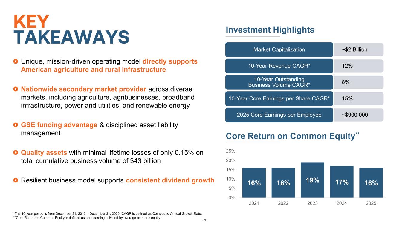 16 QUALITY EARNINGS DRIVE STRONG SHAREHOLDER RETURNS $35 $38 $41 $48 $61 $78 34% 33% 33% 28% 36% 36% 0% 10% 20% 30% 40% 50% 60% 70% 80% 90% 100% $0 $10 $20 $30 $40 $50 $60 $70 $80 2020 2021 2022 2023 2024 2025 Core Earnings Payout Ratio (% ) $ in m ill io ns Common Stock Dividends Share Repurchase Payout Ratio Strong earnings and consistent capital position support continued dividend growth • 2026 marks the 15th consecutive year of increased quarterly dividends for Farmer Mac Farmer Mac is committed to strong shareholder returns, including responsible dividend growth • Previous and expected future earnings growth • An adequate level of capital that exceeds our requirements • Expectations for future business volume growth Dividend Yield (as of 12/31/2025) Dividend CAGR (2021 - 2026) Farmer Mac 3.4% 12.7% S&P 500 1.1% 5.5% Russell 2000 1.3% 8.5%