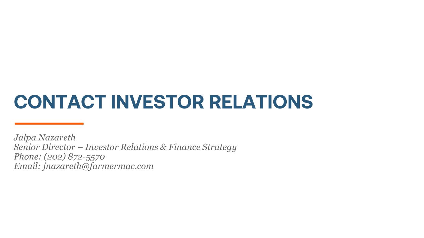 Jalpa Nazareth Senior Director – Investor Relations & Finance Strategy Phone: (202) 872-5570 Email: jnazareth@farmermac.com CONTACT INVESTOR RELATIONS