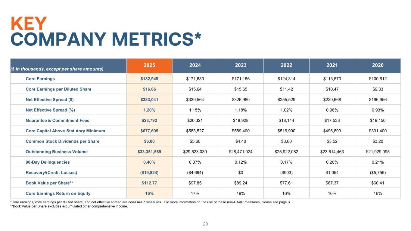 20 KEY COMPANY METRICS* ($ in thousands, except per share amounts) 2025 2024 2023 2022 2021 2020 Core Earnings $182,949 $171,630 $171,156 $124,314 $113,570 $100,612 Core Earnings per Diluted Share $16.66 $15.64 $15.65 $11.42 $10.47 $9.33 Net Effective Spread ($) $383,041 $339,564 $326,980 $255,529 $220,668 $196,956 Net Effective Spread (%) 1.20% 1.15% 1.18% 1.02% 0.98% 0.93% Guarantee & Commitment Fees $23,792 $20,321 $18,928 $18,144 $17,533 $19,150 Core Capital Above Statutory Minimum $677,695 $583,527 $589,400 $516,900 $496,800 $331,400 Common Stock Dividends per Share $6.00 $5.60 $4.40 $3.80 $3.52 $3.20 Outstanding Business Volume $33,351,569 $29,523,030 $28,471,024 $25,922,082 $23,614,463 $21,929,095 90-Day Delinquencies 0.40% 0.37% 0.12% 0.17% 0.20% 0.21% Recovery/(Credit Losses) ($19,824) ($4,694) $0 ($903) $1,054 ($5,759) Book Value per Share** $112.77 $97.85 $89.24 $77.61 $67.37 $60.41 Core Earnings Return on Equity 16% 17% 19% 16% 16% 16% *Core earnings, core earnings per diluted share, and net effective spread are non-GAAP measures. For more information on the use of these non-GAAP measures, please see page 3. **Book Value per Share excludes accumulated other comprehensive income.