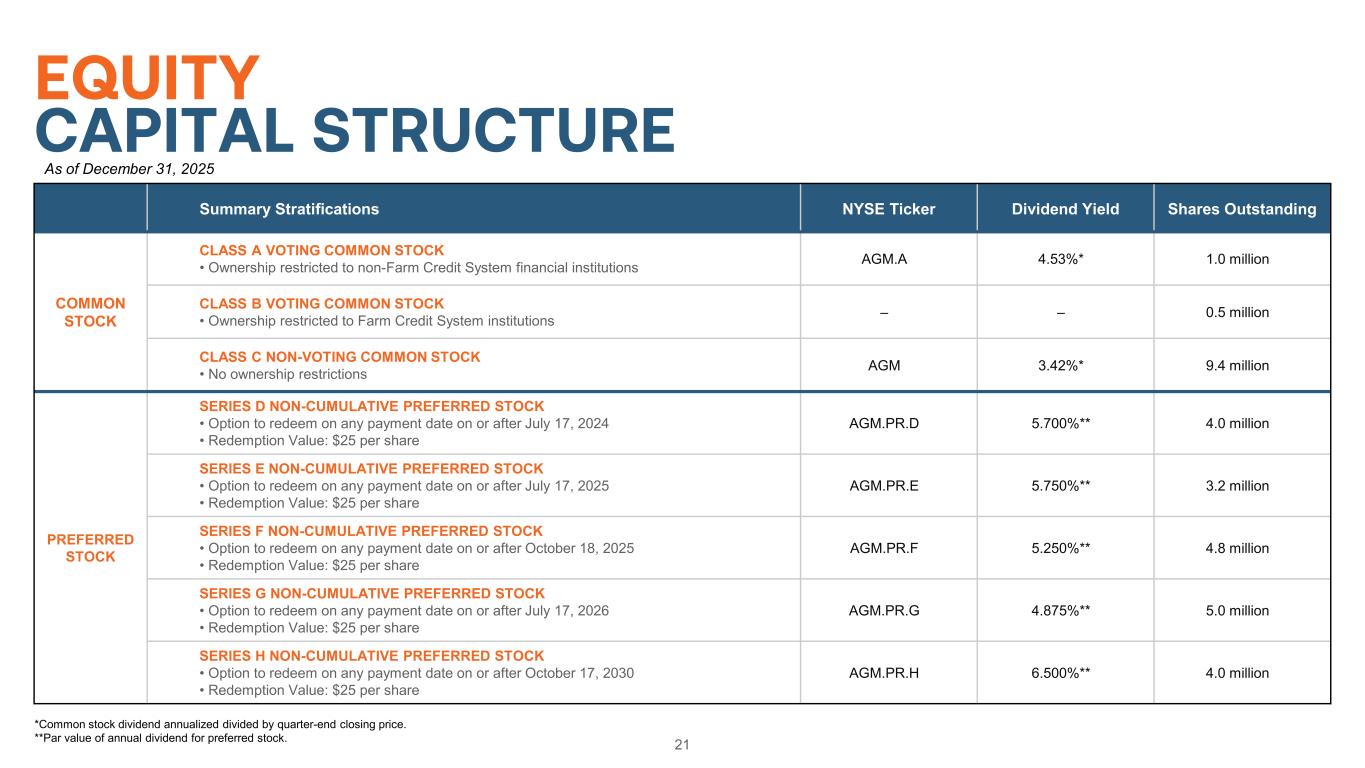 21 EQUITY CAPITAL STRUCTURE *Common stock dividend annualized divided by quarter-end closing price. **Par value of annual dividend for preferred stock. Summary Stratifications NYSE Ticker Dividend Yield Shares Outstanding COMMON STOCK CLASS A VOTING COMMON STOCK • Ownership restricted to non-Farm Credit System financial institutions AGM.A 4.53%* 1.0 million CLASS B VOTING COMMON STOCK • Ownership restricted to Farm Credit System institutions – – 0.5 million CLASS C NON-VOTING COMMON STOCK • No ownership restrictions AGM 3.42%* 9.4 million PREFERRED STOCK SERIES D NON-CUMULATIVE PREFERRED STOCK • Option to redeem on any payment date on or after July 17, 2024 • Redemption Value: $25 per share AGM.PR.D 5.700%** 4.0 million SERIES E NON-CUMULATIVE PREFERRED STOCK • Option to redeem on any payment date on or after July 17, 2025 • Redemption Value: $25 per share AGM.PR.E 5.750%** 3.2 million SERIES F NON-CUMULATIVE PREFERRED STOCK • Option to redeem on any payment date on or after October 18, 2025 • Redemption Value: $25 per share AGM.PR.F 5.250%** 4.8 million SERIES G NON-CUMULATIVE PREFERRED STOCK • Option to redeem on any payment date on or after July 17, 2026 • Redemption Value: $25 per share AGM.PR.G 4.875%** 5.0 million SERIES H NON-CUMULATIVE PREFERRED STOCK • Option to redeem on any payment date on or after October 17, 2030 • Redemption Value: $25 per share AGM.PR.H 6.500%** 4.0 million As of December 31, 2025