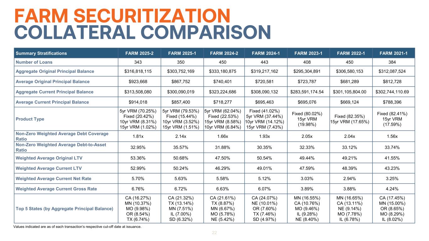 Summary Stratifications FARM 2025-2 FARM 2025-1 FARM 2024-2 FARM 2024-1 FARM 2023-1 FARM 2022-1 FARM 2021-1 Number of Loans 343 350 450 443 408 450 384 Aggregate Original Principal Balance $316,818,115 $303,752,169 $333,180,875 $319,217,162 $295,304,891 $306,580,153 $312,087,524 Average Original Principal Balance $923,668 $867,752 $740,401 $720,581 $723,787 $681,289 $812,728 Aggregate Current Principal Balance $313,508,080 $300,090,019 $323,224,686 $308,090,132 $283,591,174.54 $301,105,804.00 $302,744,110.69 Average Current Principal Balance $914,018 $857,400 $718,277 $695,463 $695,076 $669,124 $788,396 Product Type 5yr VRM (70.25%) Fixed (20.42%) 10yr VRM (8.31%) 15yr VRM (1.02%) 5yr VRM (79.53%) Fixed (15.44%) 10yr VRM (3.52%) 15yr VRM (1.51%) 5yr VRM (62.04%) Fixed (22.53%) 15yr VRM (8.58%) 10yr VRM (6.84%) Fixed (41.02%) 5yr VRM (37.44%) 10yr VRM (14.12%) 15yr VRM (7.43%) Fixed (80.02%) 15yr VRM (19.98%) Fixed (82.35%) 15yr VRM (17.65%) Fixed (82.41%) 15yr VRM (17.59%) Non-Zero Weighted Average Debt Coverage Ratio 1.81x 2.14x 1.66x 1.93x 2.05x 2.04x 1.56x Non-Zero Weighted Average Debt-to-Asset Ratio 32.95% 35.57% 31.88% 30.35% 32.33% 33.12% 33.74% Weighted Average Original LTV 53.36% 50.68% 47.50% 50.54% 49.44% 49.21% 41.55% Weighted Average Current LTV 52.99% 50.24% 46.29% 49.01% 47.59% 48.39% 43.23% Weighted Average Current Net Rate 5.70% 5.63% 5.58% 5.12% 3.03% 2.94% 3.25% Weighted Average Current Gross Rate 6.76% 6.72% 6.63% 6.07% 3.89% 3.88% 4.24% Top 5 States (by Aggregate Principal Balance) CA (16.27%) MN (10.37%) MO (9.98%) OR (8.54%) TX (6.74%) CA (21.32%) TX (13.14%) MN (7.51%) IL (7.00%) SD (6.32%) CA (21.61%) TX (8.87%) MN (6.67%) MO (5.78%) NE (5.42%) CA (24.07%) NE (10.01%) OR (7.60%) TX (7.46%) SD (4.97%) MN (16.55%) CA (10.76%) MO (9.46%) IL (9.28%) NE (8.40%) MN (16.65%) CA (13.11%) NE (9.14%) MO (7.78%) IL (6.78%) CA (17.45%) MN (15.00%) OR (8.65%) MO (8.29%) IL (8.02%) Values indicated are as of each transaction’s respective cut-off date at issuance. FARM SECURITIZATION COLLATERAL COMPARISON 22