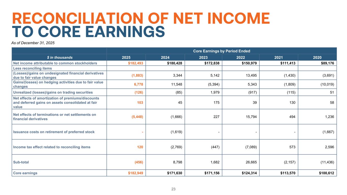 23 RECONCILIATION OF NET INCOME TO CORE EARNINGS Core Earnings by Period Ended $ in thousands 2025 2024 2023 2022 2021 2020 Net income attributable to common stockholders $182,493 $180,428 $172,838 $150,979 $111,413 $89,176 Less reconciling items (Losses)/gains on undesignated financial derivatives due to fair value changes (1,883) 3,344 5,142 13,495 (1,430) (3,691) Gains/(losses) on hedging activities due to fair value changes 6,778 11,548 (5,394) 5,343 (1,809) (10,019) Unrealized (losses)/gains on trading securities (126) (85) 1,979 (917) (115) 51 Net effects of amortization of premiums/discounts and deferred gains on assets consolidated at fair value 103 45 175 39 130 58 Net effects of terminations or net settlements on financial derivatives (5,448) (1,666) 227 15,794 494 1,236 Issuance costs on retirement of preferred stock - (1,619) - - - (1,667) Income tax effect related to reconciling items 120 (2,769) (447) (7,089) 573 2,596 Sub-total (456) 8,798 1,682 26,665 (2,157) (11,436) Core earnings $182,949 $171,630 $171,156 $124,314 $113,570 $100,612 As of December 31, 2025