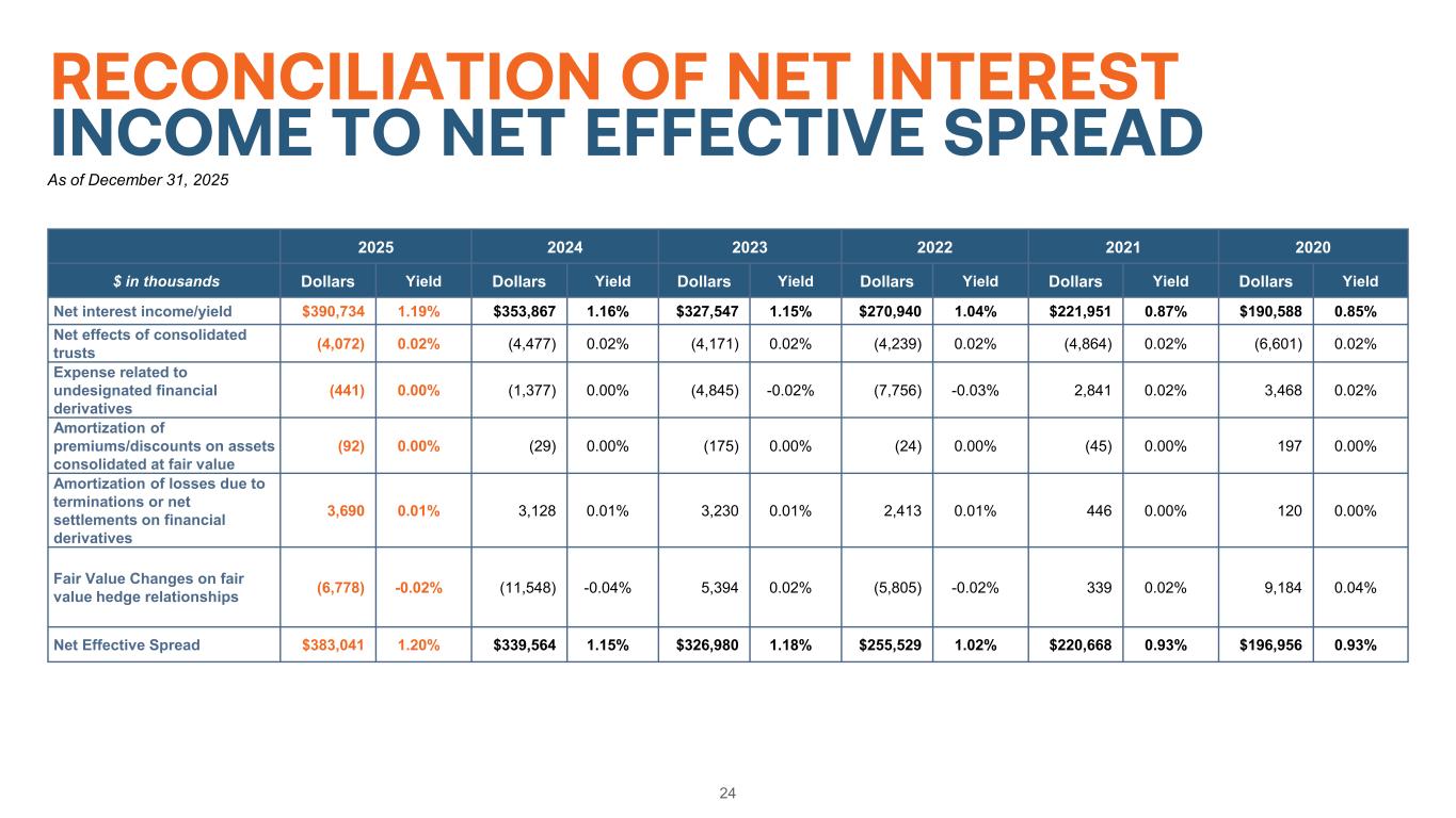 24 RECONCILIATION OF NET INTEREST INCOME TO NET EFFECTIVE SPREAD 2025 2024 2023 2022 2021 2020 $ in thousands Dollars Yield Dollars Yield Dollars Yield Dollars Yield Dollars Yield Dollars Yield Net interest income/yield $390,734 1.19% $353,867 1.16% $327,547 1.15% $270,940 1.04% $221,951 0.87% $190,588 0.85% Net effects of consolidated trusts (4,072) 0.02% (4,477) 0.02% (4,171) 0.02% (4,239) 0.02% (4,864) 0.02% (6,601) 0.02% Expense related to undesignated financial derivatives (441) 0.00% (1,377) 0.00% (4,845) -0.02% (7,756) -0.03% 2,841 0.02% 3,468 0.02% Amortization of premiums/discounts on assets consolidated at fair value (92) 0.00% (29) 0.00% (175) 0.00% (24) 0.00% (45) 0.00% 197 0.00% Amortization of losses due to terminations or net settlements on financial derivatives 3,690 0.01% 3,128 0.01% 3,230 0.01% 2,413 0.01% 446 0.00% 120 0.00% Fair Value Changes on fair value hedge relationships (6,778) -0.02% (11,548) -0.04% 5,394 0.02% (5,805) -0.02% 339 0.02% 9,184 0.04% Net Effective Spread $383,041 1.20% $339,564 1.15% $326,980 1.18% $255,529 1.02% $220,668 0.93% $196,956 0.93% As of December 31, 2025