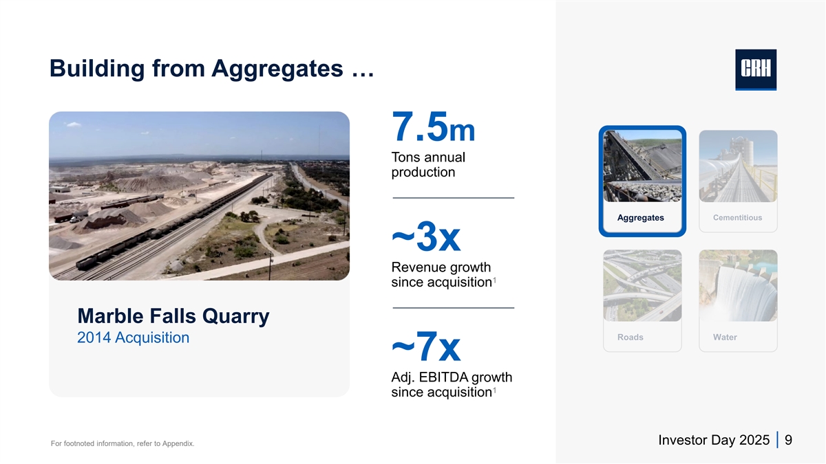 1 CRH in Texas Strengthening our connected portfolio through acquisition … Since 2014 Certain assets Eco of Capitol Ash Grove Angel East Texas Aggregates Cement Brothers Asphalt Material May-14 Jun-18 Mar-21 Dec-22 Sep-25 >25 acquisitions Oct-15 Dec-20 Apr-22 Feb-24 >1,000bps Asphalt Martin Certain assets Hunter assets of Enterprises of Rinker Cement plant Adj. EBITDA 2 Martin Materials & margin expansion Marietta 20 RMC plants … maintaining & leveraging strong local brands & leadership teams Inv Inves estor tor Day Day 2025 2025 8 8 For footnoted information, refer to Appendix.