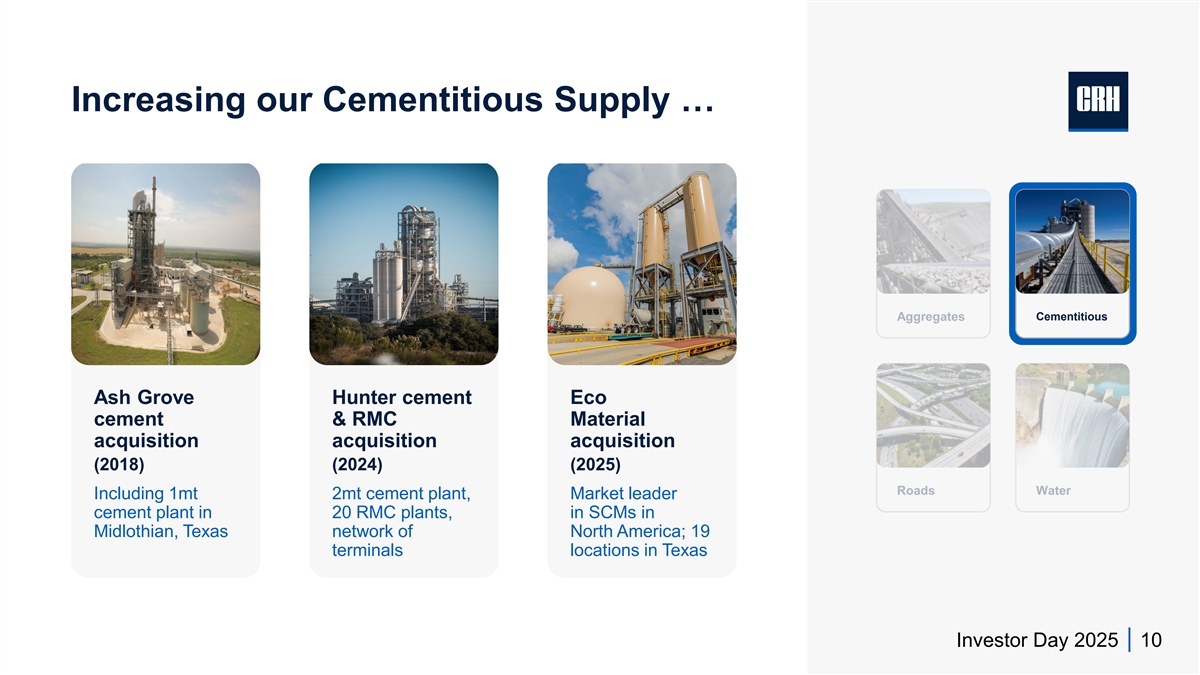 Building from Aggregates … 7.5m Tons annual production Aggregates Cementitious ~3x Revenue growth 1 since acquisition Marble Falls Quarry Roads Water 2014 Acquisition ~7x Adj. EBITDA growth 1 since acquisition Inv Inves estor tor Day Day 2025 2025 9 9 For footnoted information, refer to Appendix.