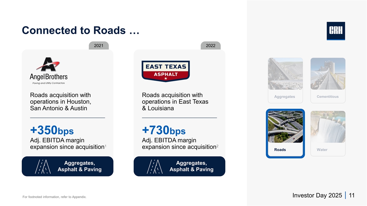 Connected to Roads … 2021 2022 Roads acquisition with Roads acquisition with Aggregates Cementitious operations in Houston, operations in East Texas San Antonio & Austin & Louisiana +350bps +730bps Adj. EBITDA margin Adj. EBITDA margin 1 2 expansion since acquisition expansion since acquisition Roads Water Aggregates, Aggregates, Asphalt & Paving Asphalt & Paving Inv Inves estor tor Day Day 2025 2025 11 11 For footnoted information, refer to Appendix.