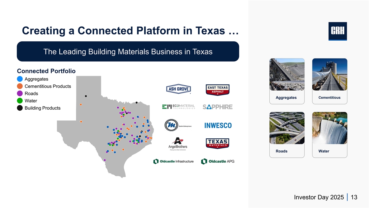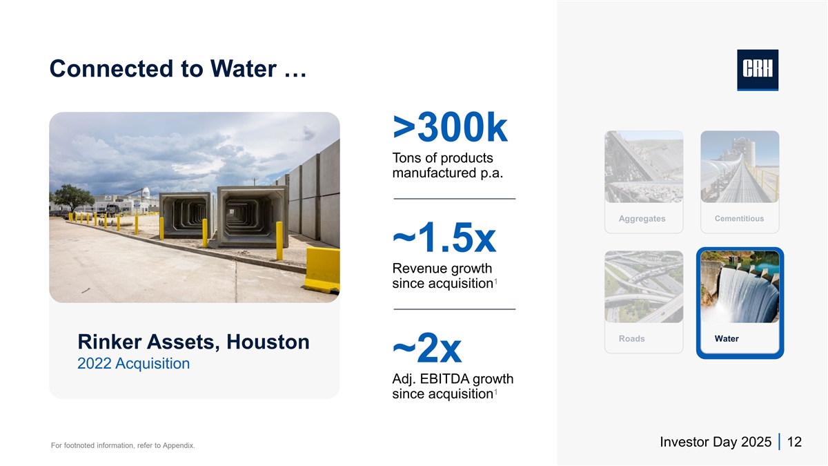 Connected to Water … >300k Tons of products manufactured p.a. Aggregates Cementitious ~1.5x Revenue growth 1 since acquisition Roads Water Rinker Assets, Houston ~2x 2022 Acquisition Adj. EBITDA growth 1 since acquisition Inv Inves estor tor Day Day 2025 2025 12 12 For footnoted information, refer to Appendix.