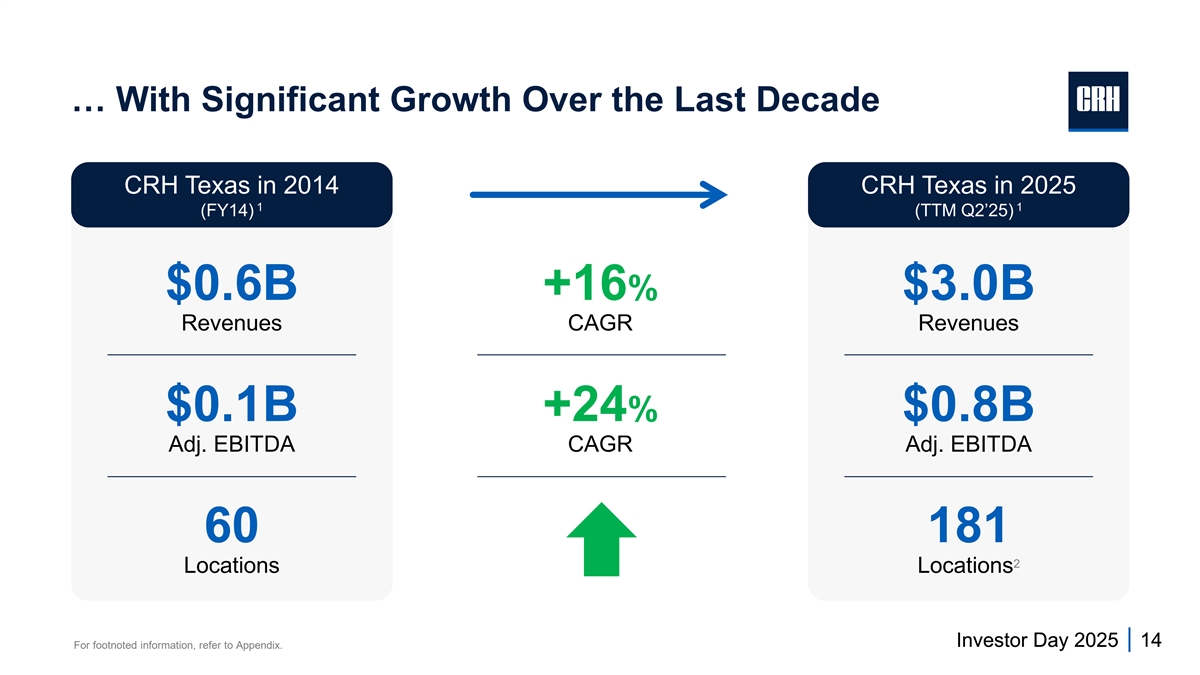 … With Significant Growth Over the Last Decade CRH Texas in 2014 CRH Texas in 2025 1 1 (FY14) (TTM Q2’25) $0.6B +16% $3.0B Revenues CAGR Revenues $0.1B +24% $0.8B Adj. EBITDA CAGR Adj. EBITDA 60 181 2 Locations Locations Inv Inves estor tor Day Day 2025 2025 14 14 For footnoted information, refer to Appendix.