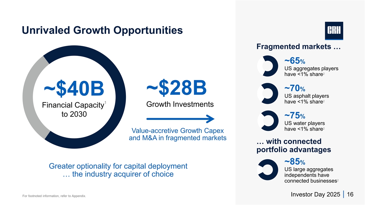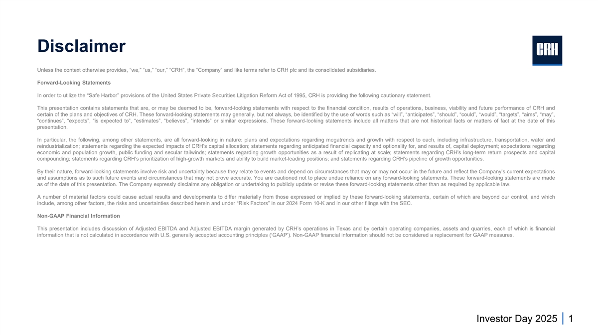 Disclaimer Unless the context otherwise provides, “we,” “us,” “our,” “CRH”, the “Company” and like terms refer to CRH plc and its consolidated subsidiaries. Forward-Looking Statements In order to utilize the “Safe Harbor” provisions of the United States Private Securities Litigation Reform Act of 1995, CRH is providing the following cautionary statement. This presentation contains statements that are, or may be deemed to be, forward-looking statements with respect to the financial condition, results of operations, business, viability and future performance of CRH and certain of the plans and objectives of CRH. These forward-looking statements may generally, but not always, be identified by the use of words such as “will”, “anticipates”, “should”, “could”, “would”, “targets”, “aims”, “may”, “continues”, “expects”, “is expected to”, “estimates”, “believes”, “intends” or similar expressions. These forward-looking statements include all matters that are not historical facts or matters of fact at the date of this presentation. In particular, the following, among other statements, are all forward-looking in nature: plans and expectations regarding megatrends and growth with respect to each, including infrastructure, transportation, water and reindustrialization; statements regarding the expected impacts of CRH’s capital allocation; statements regarding anticipated financial capacity and optionality for, and results of, capital deployment; expectations regarding economic and population growth, public funding and secular tailwinds; statements regarding growth opportunities as a result of replicating at scale; statements regarding CRH's long-term return prospects and capital compounding; statements regarding CRH’s prioritization of high-growth markets and ability to build market-leading positions; and statements regarding CRH’s pipeline of growth opportunities. By their nature, forward-looking statements involve risk and uncertainty because they relate to events and depend on circumstances that may or may not occur in the future and reflect the Company’s current expectations and assumptions as to such future events and circumstances that may not prove accurate. You are cautioned not to place undue reliance on any forward-looking statements. These forward-looking statements are made as of the date of this presentation. The Company expressly disclaims any obligation or undertaking to publicly update or revise these forward-looking statements other than as required by applicable law. A number of material factors could cause actual results and developments to differ materially from those expressed or implied by these forward-looking statements, certain of which are beyond our control, and which include, among other factors, the risks and uncertainties described herein and under “Risk Factors” in our 2024 Form 10-K and in our other filings with the SEC. Non-GAAP Financial Information This presentation includes discussion of Adjusted EBITDA and Adjusted EBITDA margin generated by CRH’s operations in Texas and by certain operating companies, assets and quarries, each of which is financial information that is not calculated in accordance with U.S. generally accepted accounting principles (‘GAAP’). Non-GAAP financial information should not be considered a replacement for GAAP measures. Investor Day 2025 1