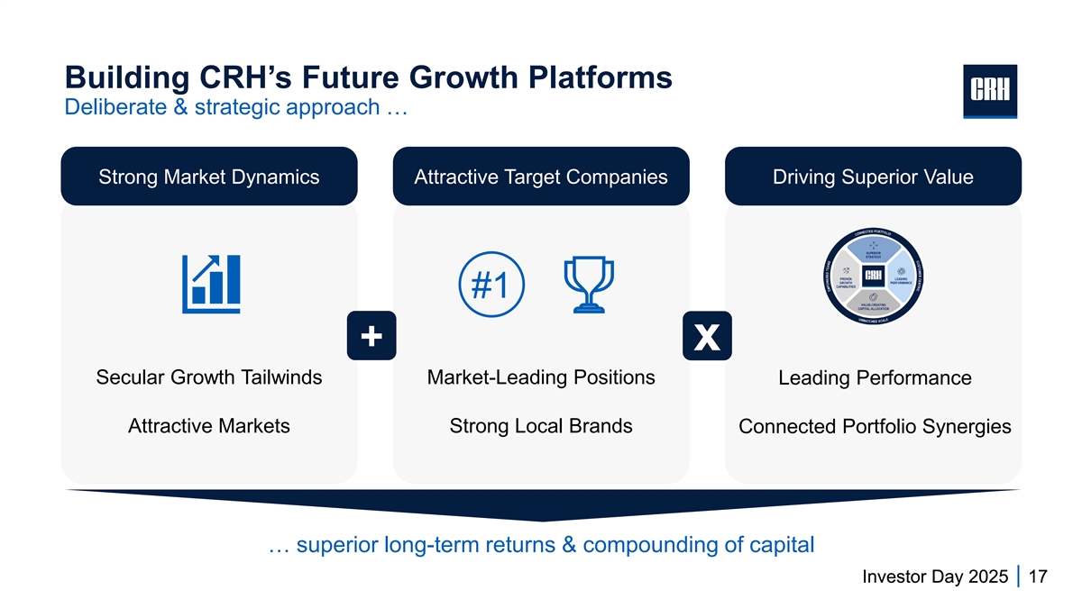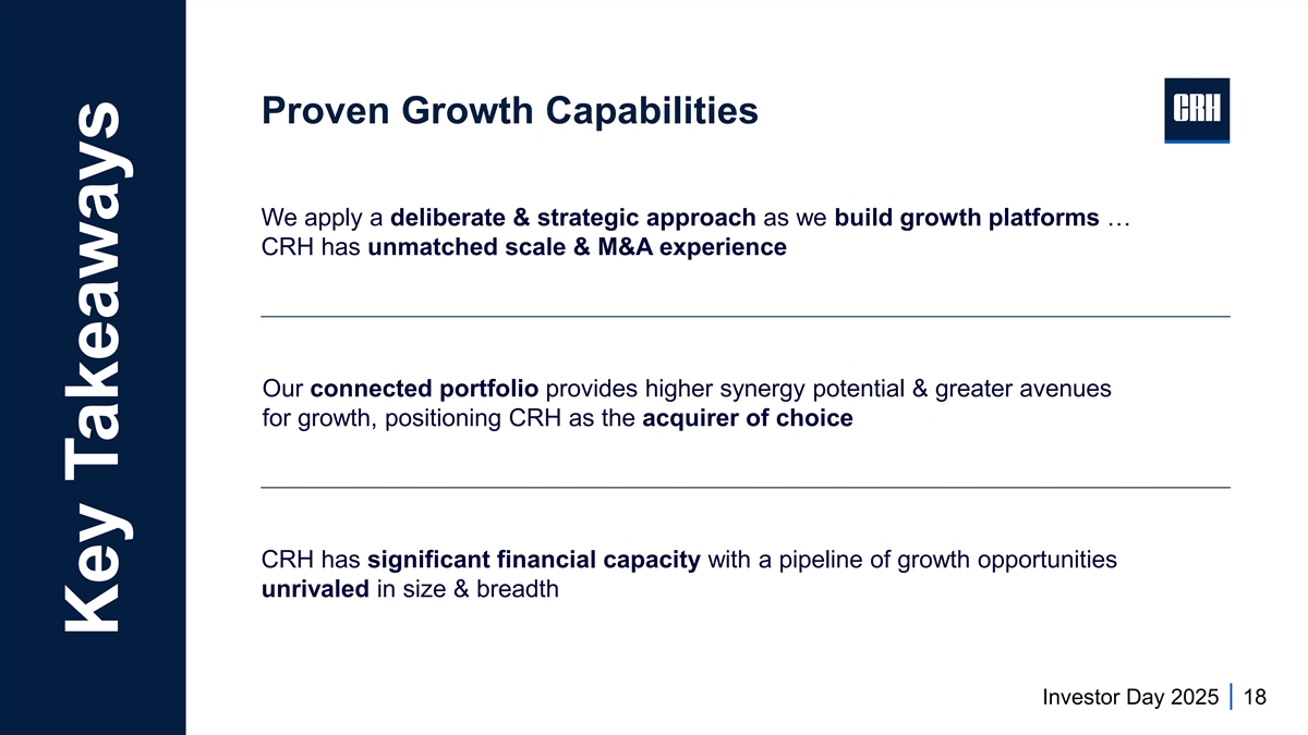 Building CRH’s Future Growth Platforms Deliberate & strategic approach … Strong Market Dynamics Attractive Target Companies Driving Superior Value #1 + x Secular Growth Tailwinds Market-Leading Positions Leading Performance Attractive Markets Strong Local Brands Connected Portfolio Synergies … superior long-term returns & compounding of capital Inv Inves estor tor Day Day 2025 2025 17 17
