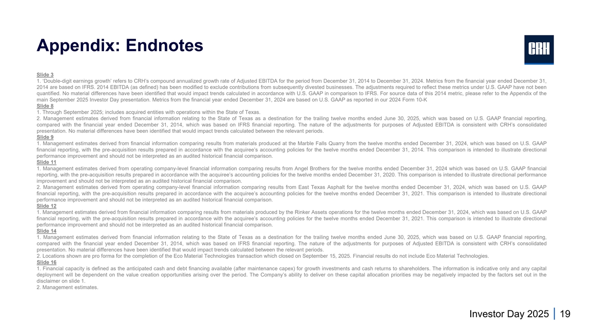 Appendix: Endnotes Slide 3 1. ‘Double-digit earnings growth’ refers to CRH’s compound annualized growth rate of Adjusted EBITDA for the period from December 31, 2014 to December 31, 2024. Metrics from the financial year ended December 31, 2014 are based on IFRS. 2014 EBITDA (as defined) has been modified to exclude contributions from subsequently divested businesses. The adjustments required to reflect these metrics under U.S. GAAP have not been quantified. No material differences have been identified that would impact trends calculated in accordance with U.S. GAAP in comparison to IFRS. For source data of this 2014 metric, please refer to the Appendix of the main September 2025 Investor Day presentation. Metrics from the financial year ended December 31, 2024 are based on U.S. GAAP as reported in our 2024 Form 10-K Slide 8 1. Through September 2025; includes acquired entities with operations within the State of Texas. 2. Management estimates derived from financial information relating to the State of Texas as a destination for the trailing twelve months ended June 30, 2025, which was based on U.S. GAAP financial reporting, compared with the financial year ended December 31, 2014, which was based on IFRS financial reporting. The nature of the adjustments for purposes of Adjusted EBITDA is consistent with CRH’s consolidated presentation. No material differences have been identified that would impact trends calculated between the relevant periods. Slide 9 1. Management estimates derived from financial information comparing results from materials produced at the Marble Falls Quarry from the twelve months ended December 31, 2024, which was based on U.S. GAAP financial reporting, with the pre-acquisition results prepared in accordance with the acquiree’s accounting policies for the twelve months ended December 31, 2014. This comparison is intended to illustrate directional performance improvement and should not be interpreted as an audited historical financial comparison. Slide 11 1. Management estimates derived from operating company-level financial information comparing results from Angel Brothers for the twelve months ended December 31, 2024 which was based on U.S. GAAP financial reporting, with the pre-acquisition results prepared in accordance with the acquiree’s accounting policies for the twelve months ended December 31, 2020. This comparison is intended to illustrate directional performance improvement and should not be interpreted as an audited historical financial comparison. 2. Management estimates derived from operating company-level financial information comparing results from East Texas Asphalt for the twelve months ended December 31, 2024, which was based on U.S. GAAP financial reporting, with the pre-acquisition results prepared in accordance with the acquiree’s accounting policies for the twelve months ended December 31, 2021. This comparison is intended to illustrate directional performance improvement and should not be interpreted as an audited historical financial comparison. Slide 12 1. Management estimates derived from financial information comparing results from materials produced by the Rinker Assets operations for the twelve months ended December 31, 2024, which was based on U.S. GAAP financial reporting, with the pre-acquisition results prepared in accordance with the acquiree’s accounting policies for the twelve months ended December 31, 2021. This comparison is intended to illustrate directional performance improvement and should not be interpreted as an audited historical financial comparison. Slide 14 1. Management estimates derived from financial information relating to the State of Texas as a destination for the trailing twelve months ended June 30, 2025, which was based on U.S. GAAP financial reporting, compared with the financial year ended December 31, 2014, which was based on IFRS financial reporting. The nature of the adjustments for purposes of Adjusted EBITDA is consistent with CRH’s consolidated presentation. No material differences have been identified that would impact trends calculated between the relevant periods. 2. Locations shown are pro forma for the completion of the Eco Material Technologies transaction which closed on September 15, 2025. Financial results do not include Eco Material Technologies. Slide 16 1. Financial capacity is defined as the anticipated cash and debt financing available (after maintenance capex) for growth investments and cash returns to shareholders. The information is indicative only and any capital deployment will be dependent on the value creation opportunities arising over the period. The Company’s ability to deliver on these capital allocation priorities may be negatively impacted by the factors set out in the disclaimer on slide 1. 2. Management estimates. Investor Day 2025 19