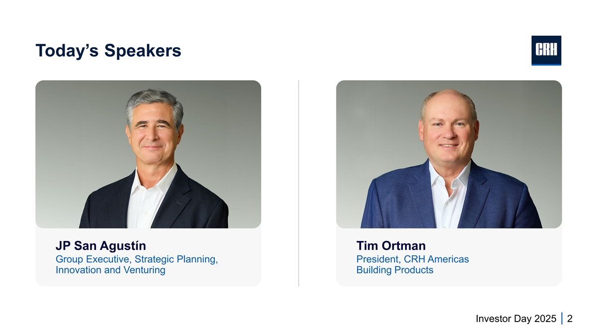 Today’s Speakers JP San Agustín Tim Ortman Group Executive, Strategic Planning, President, CRH Americas Innovation and Venturing Building Products Investor Day 2025 2