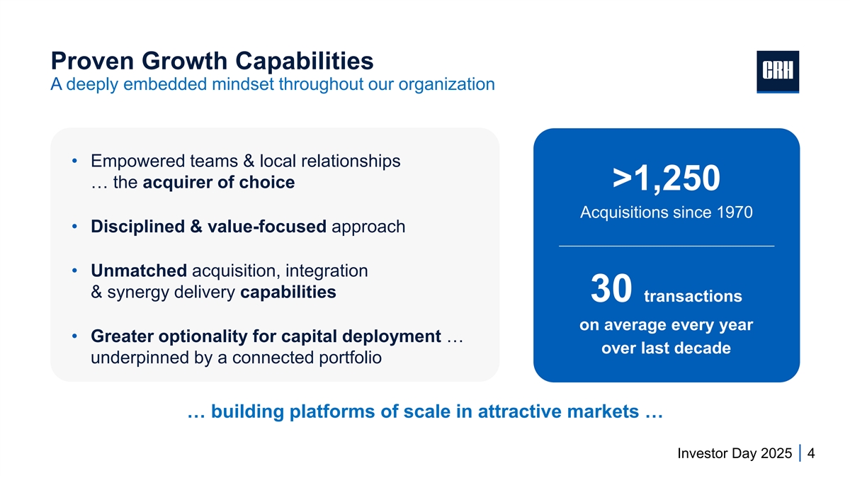 Our Growth Algorithm Growing CRH Leading Megatrends Winning Way Compounder of Capital Infrastructure Transportation x = Water Proven long-term delivery 1 Double-digit earnings growth Reindustrialization Investor Day 2025 3 For footnoted information, refer to Appendix.