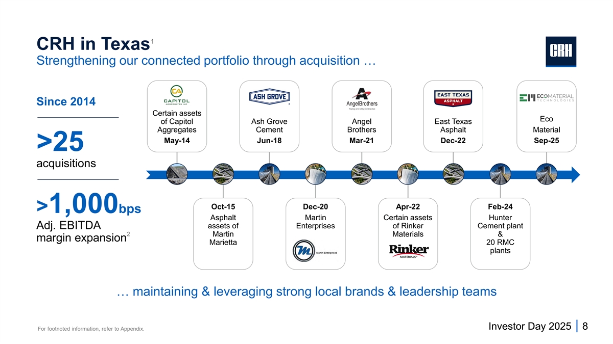 Superior Strategy Deliberate approach to capital allocation CRH identified Texas as a key growth opportunity Strong fundamentals … … with megatrend drivers Robust Growing Strong Public Significant Water Re- Economy Population Funding Road Infra Needs industrialization Demand Inv Inves estor tor Day Day 2025 2025 7 7