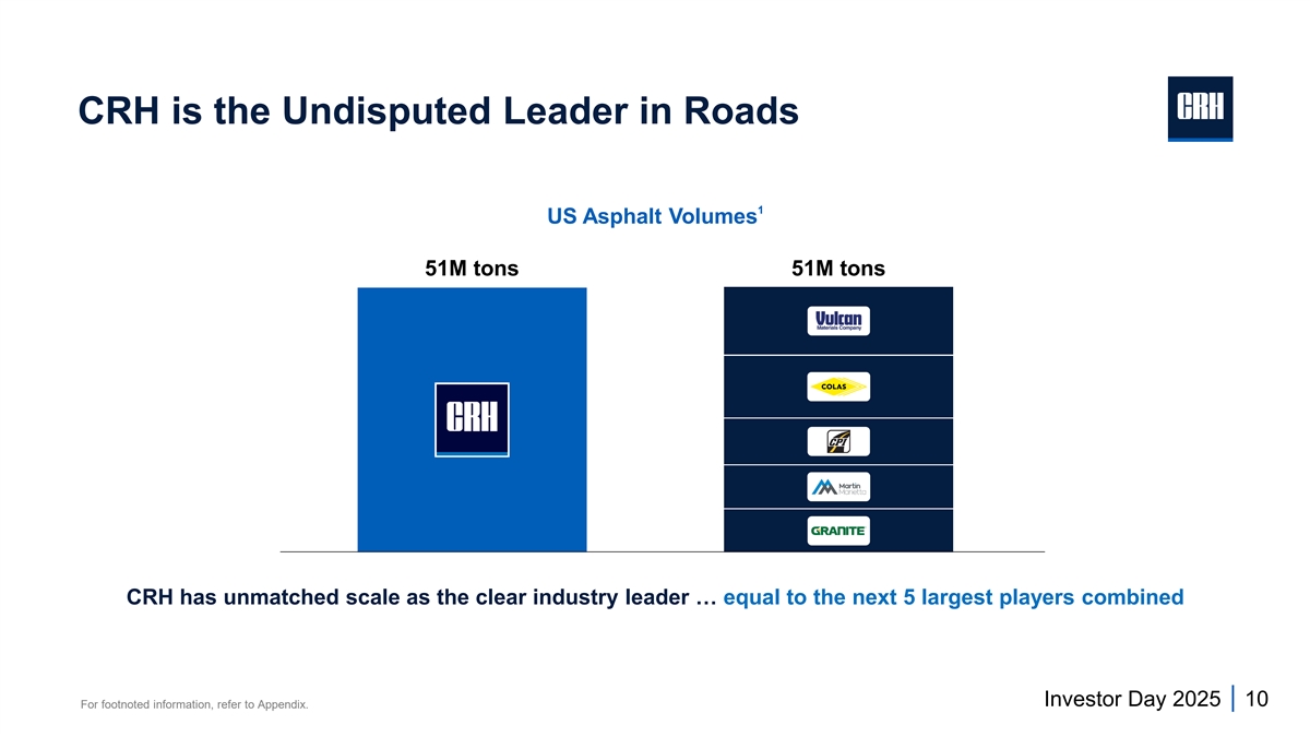 CRH is the Undisputed Leader in Roads 1 US Asphalt Volumes 51M tons CRH has unmatched scale as the clear industry leader … Investor Day 2025 9 For footnoted information, refer to Appendix.