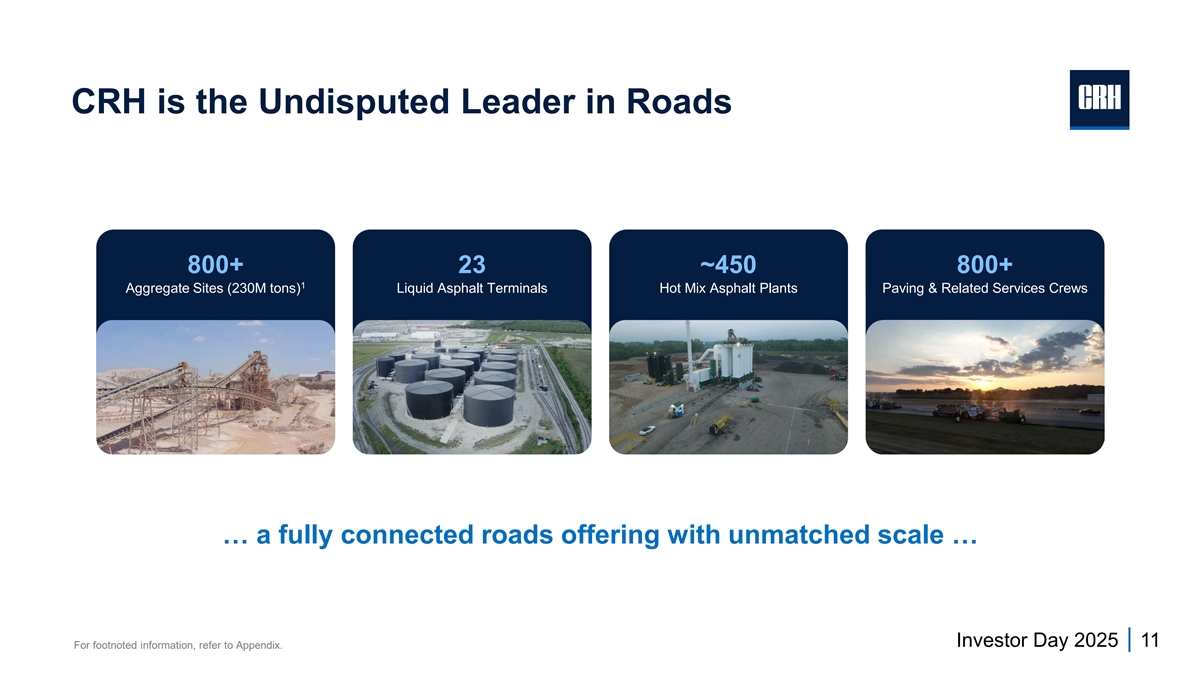 CRH is the Undisputed Leader in Roads 1 US Asphalt Volumes 51M tons 51M tons c D CRH has unmatched scale as the clear industry leader … equal to the next 5 largest players combined Investor Day 2025 10 For footnoted information, refer to Appendix.