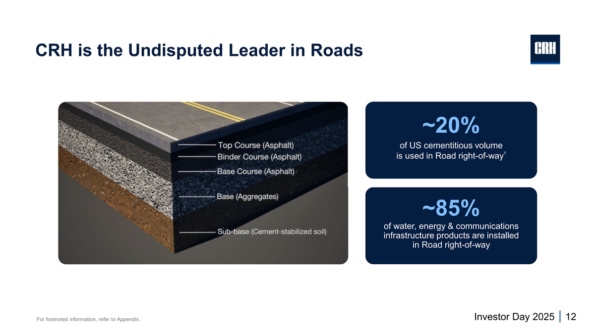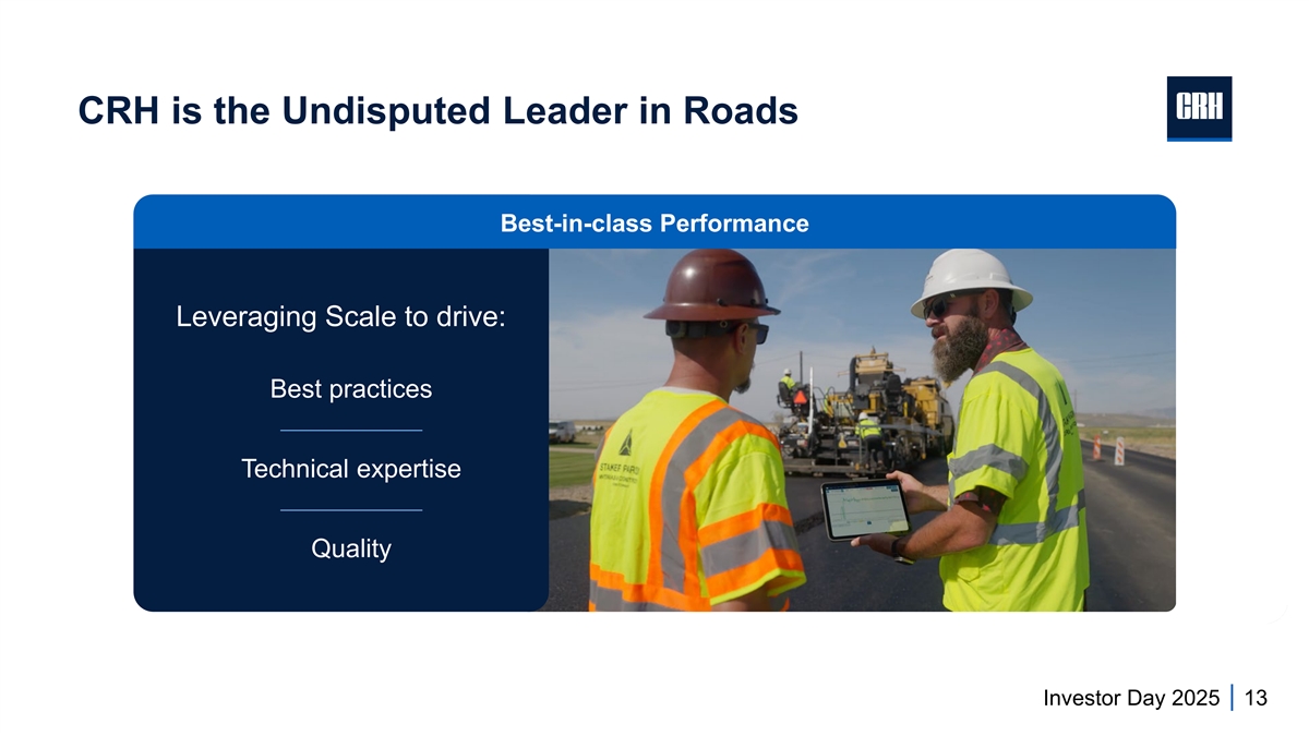 Video not running on version he sent us? 1 CRH is the Undisputed Leader in Roads ~20% of US cementitious v 1olume 1 is used in Road right-of-way ~85% of water, energy & communications infrastructure products are installed in Road right-of-way Investor Day 2025 12 For footnoted information, refer to Appendix.