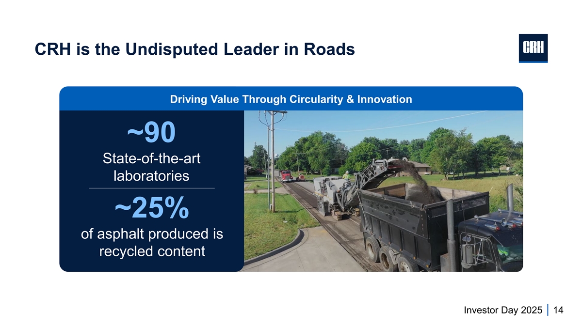 CRH is the Undisputed Leader in Roads Best-in-class Performance Leveraging Scale to drive: Best practices Technical expertise Quality Investor Day 2025 13